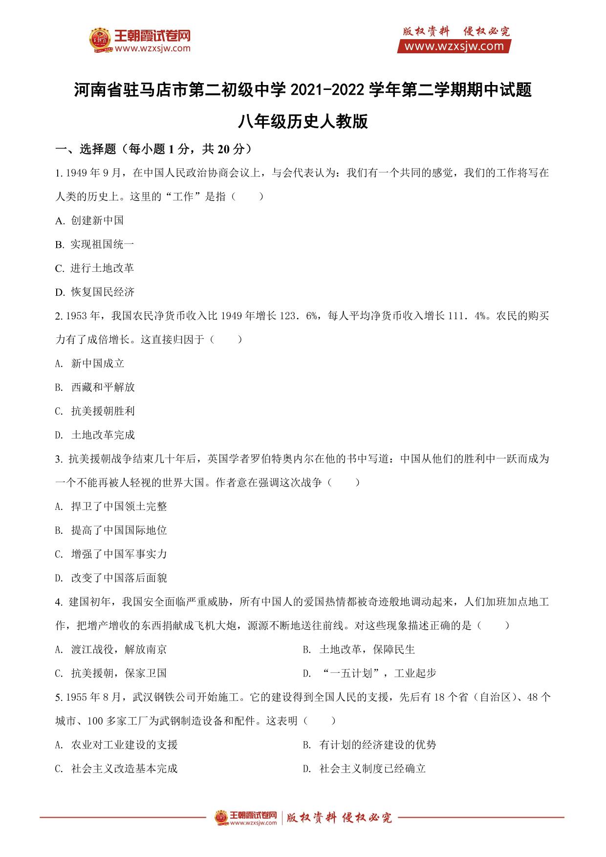 河南省驻马店市第二初级中学2021-2022学年第二学期期中试题八年级历史(人教版)