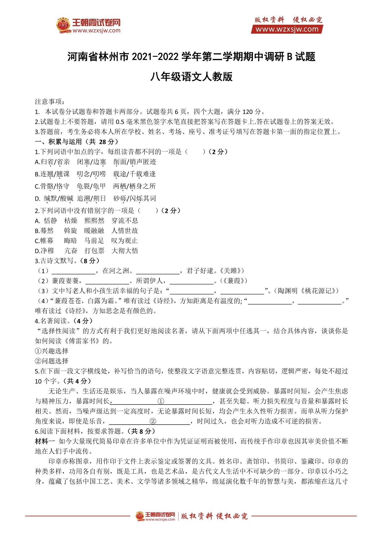 河南省林州市2021-2022学年第二学期期中调研B试题八年级语文(人教版)