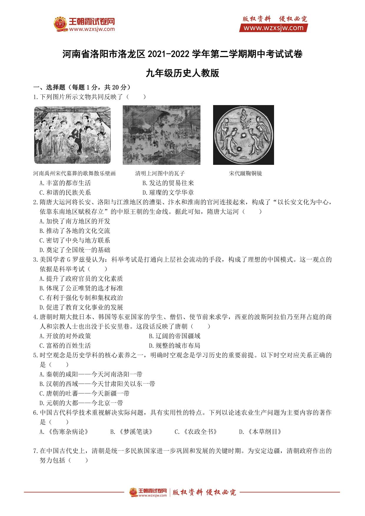河南省洛阳市洛龙区2021-2022学年第二学期期中考试试卷九年级历史(人教版)