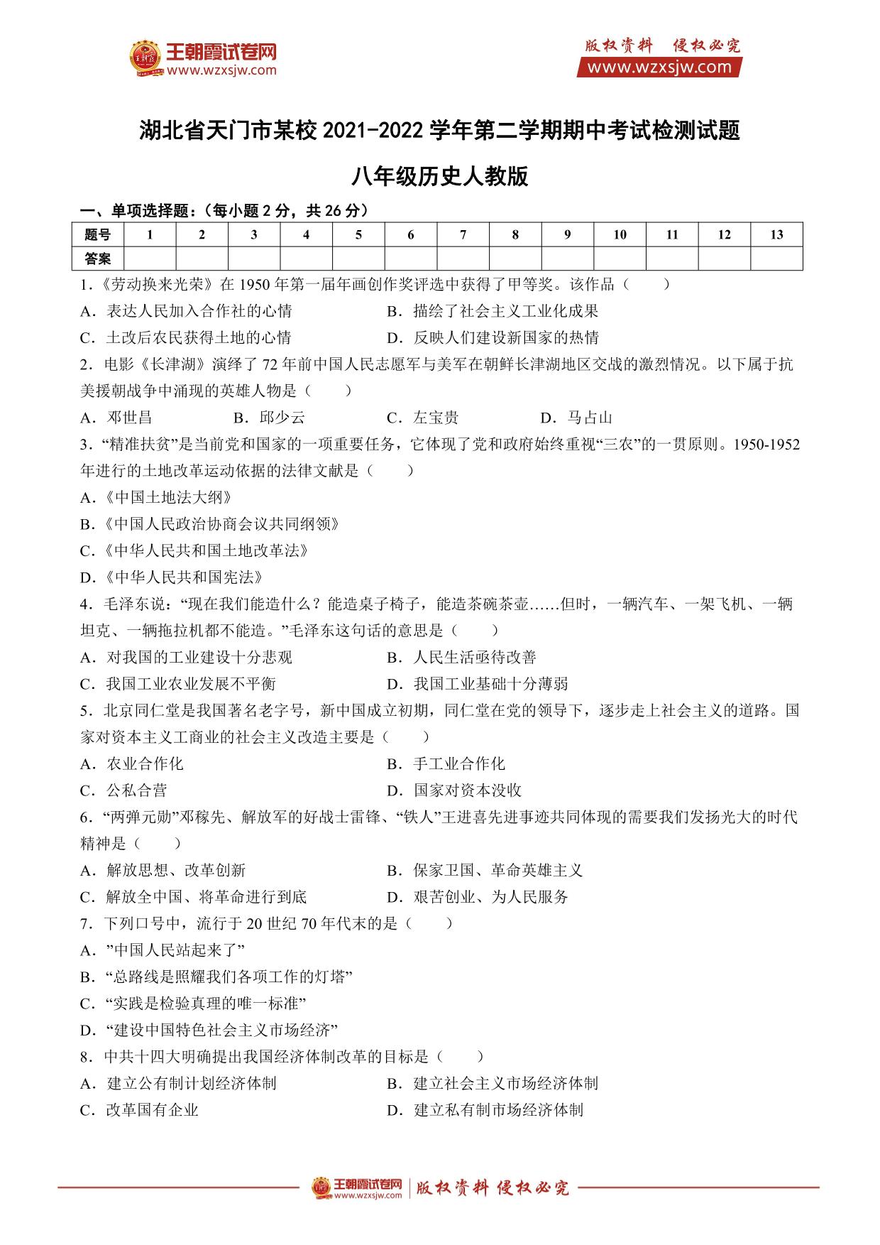湖北省天门市某校2021-2022学年第二学期期中考试检测试题八年级历史(人教版)