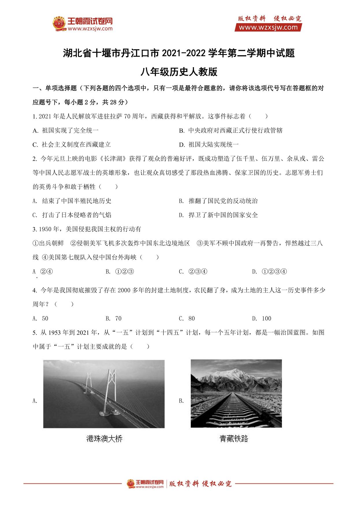 湖北省十堰市丹江口市2021-2022学年第二学期中试题八年级历史(人教版)