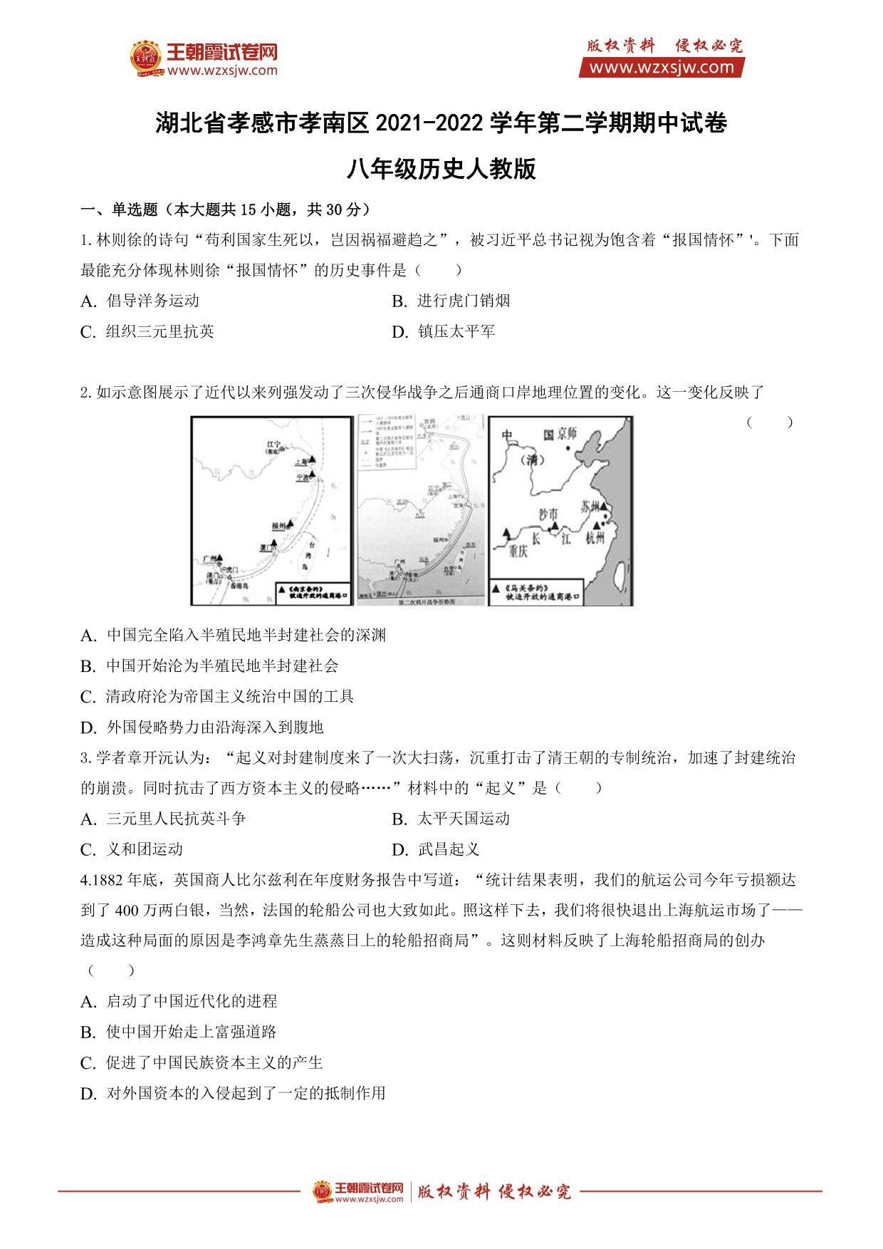 湖北省孝感市孝南区2021-2022学年人教版第二学期期中试卷八年级历史(人教版)
