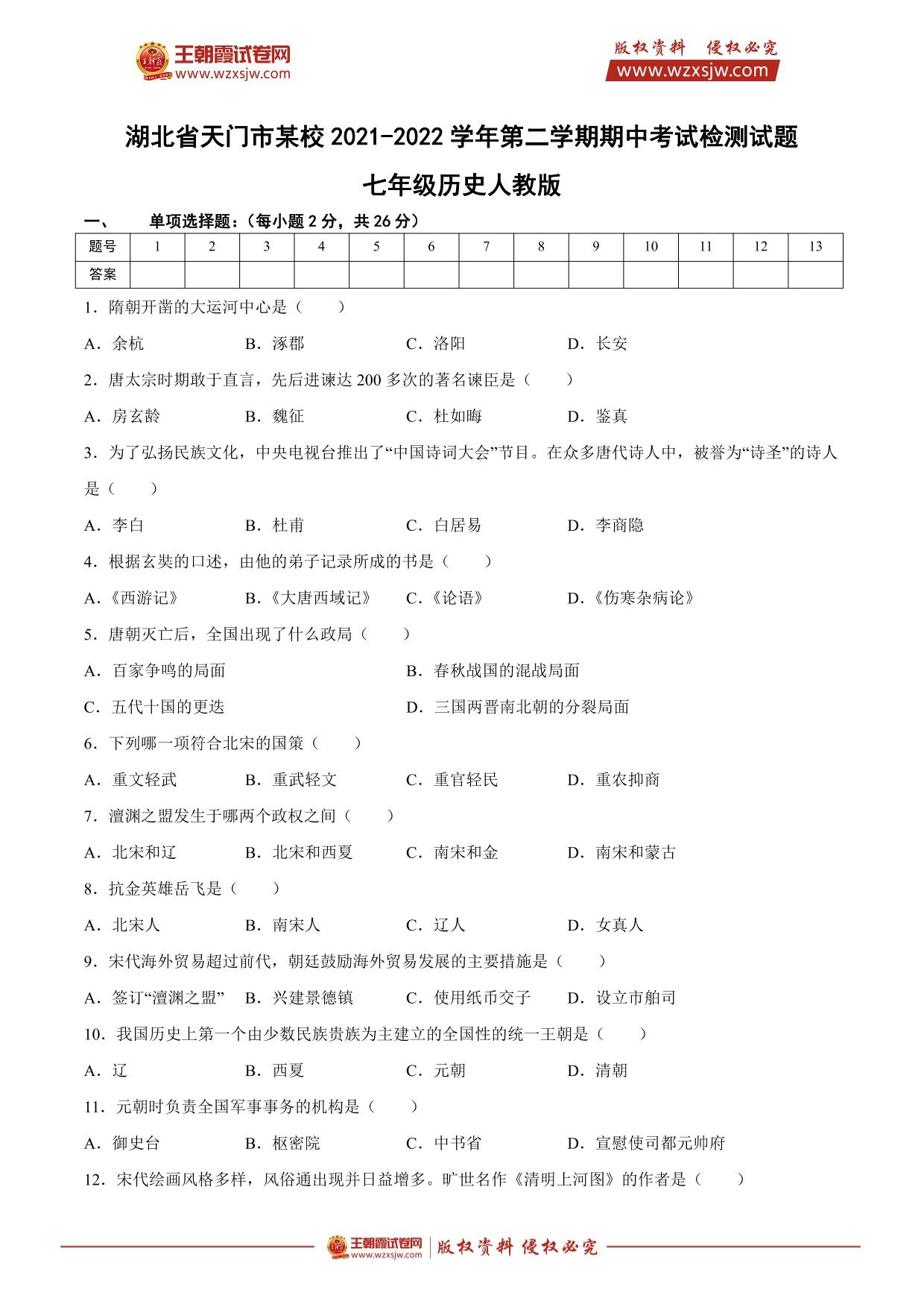 湖北省天门市某校2021-2022学年第二学期期中考试检测试题七年级历史(人教版)
