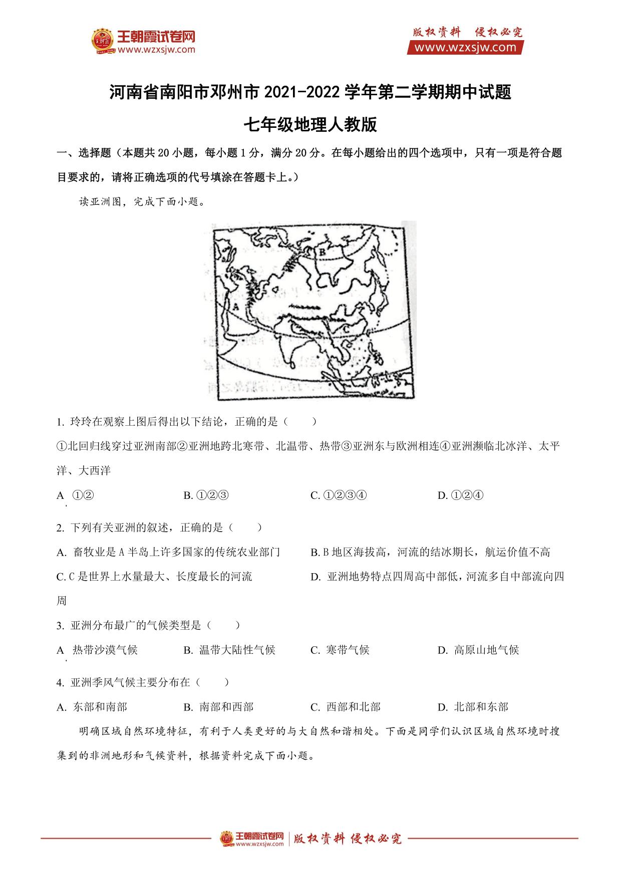 河南省南阳市邓州市2021-2022学年第二学期期中试题七年级地理(人教版)