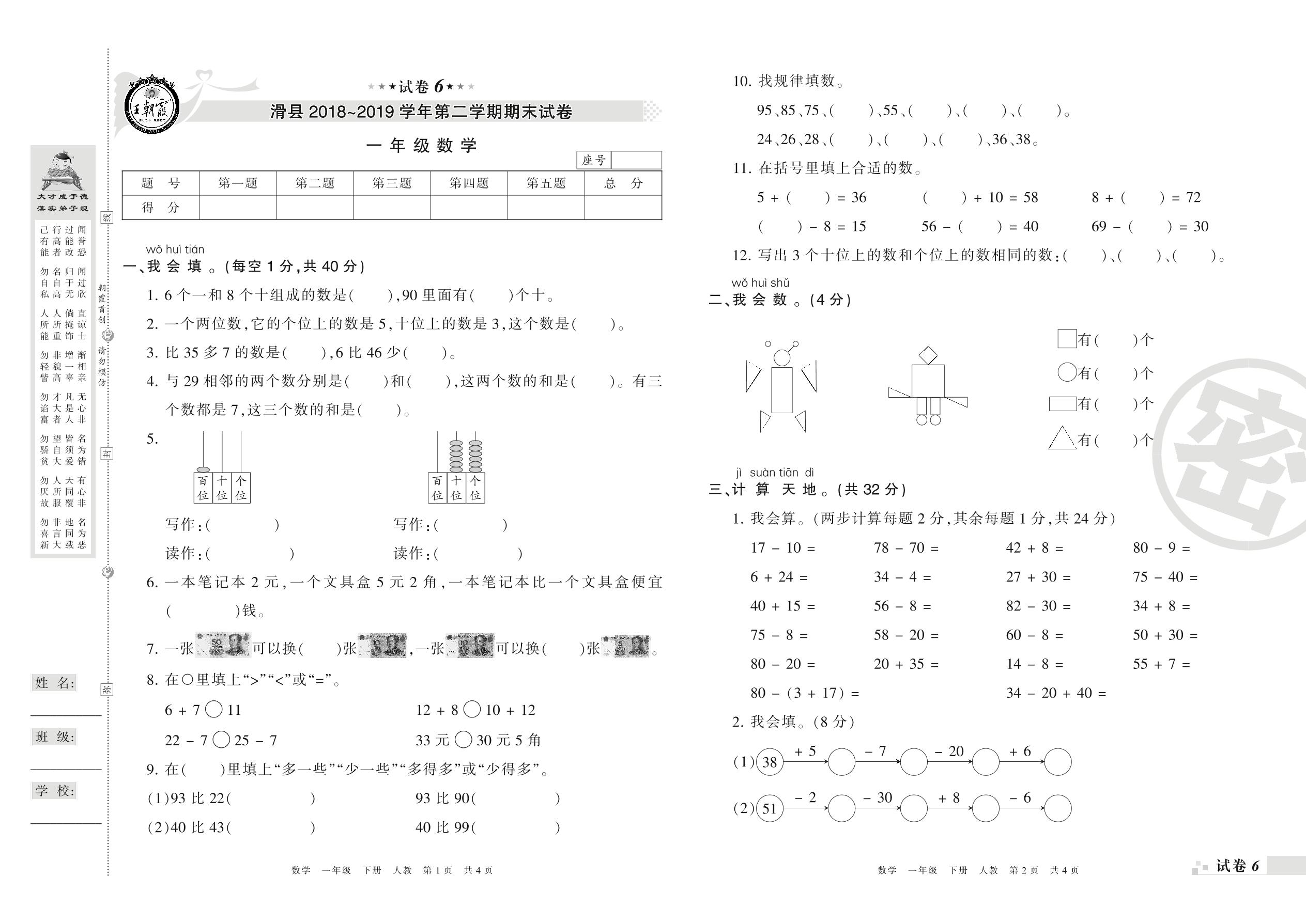 2018-2019学年第二学期安阳市滑县一年级数学试卷(人教版)【6】
