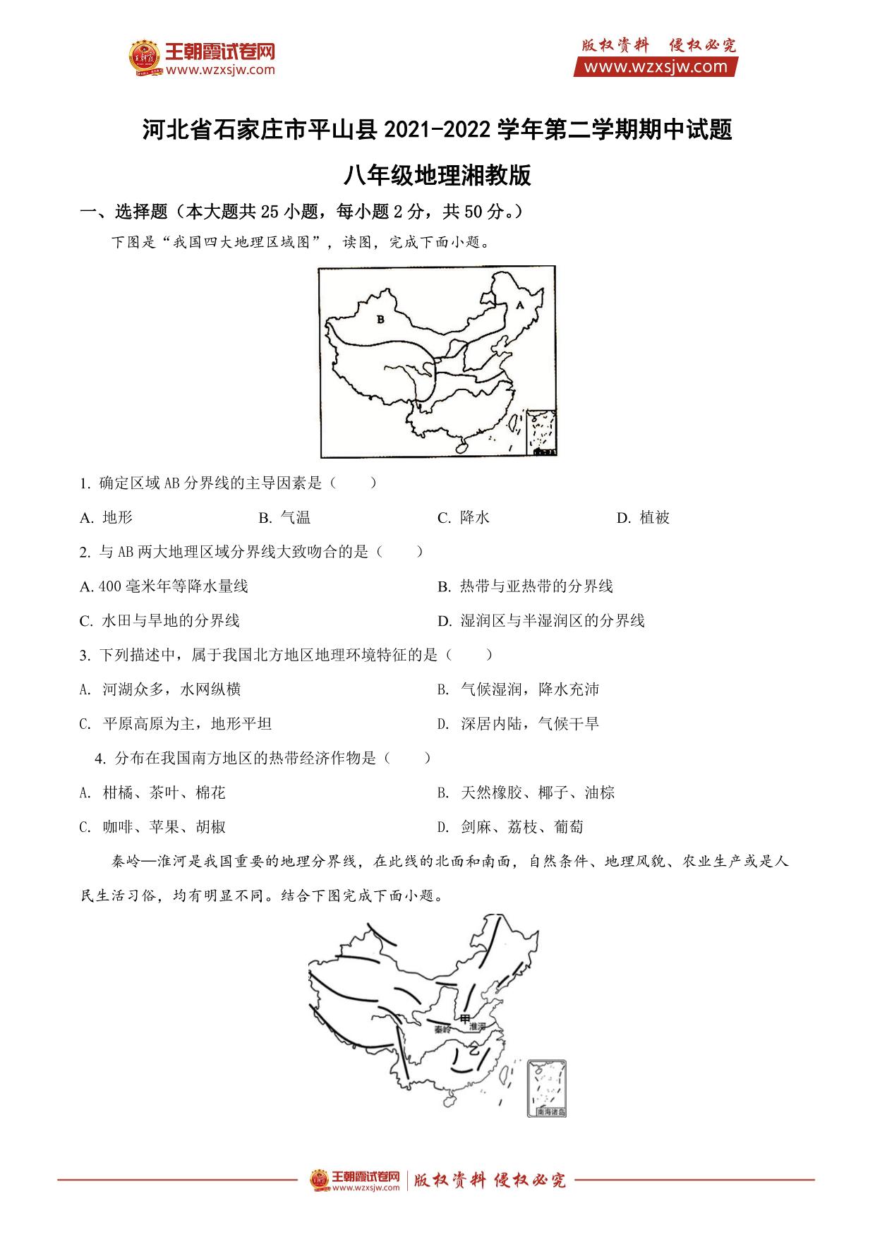 河北省石家庄市平山县2021-2022学年第二学期期中试题八年级地理(湘教版)