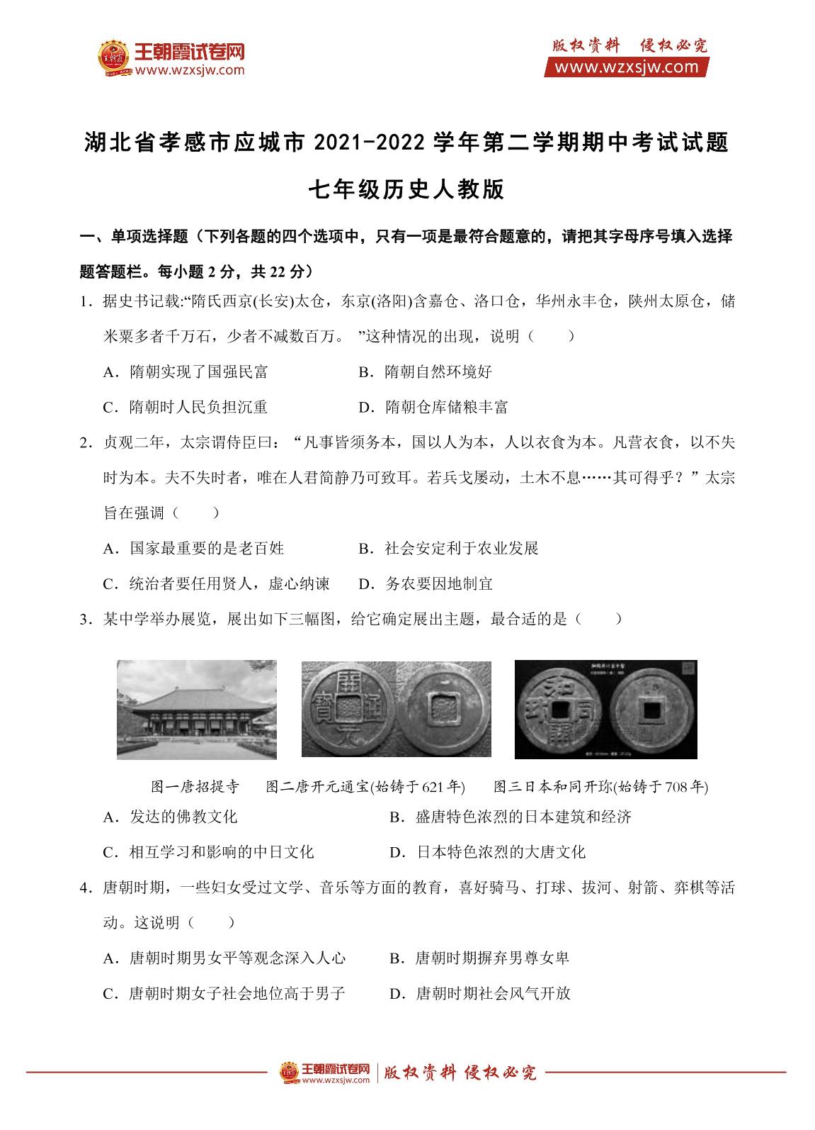 湖北省孝感市应城市2021-2022学年第二学期期中考试试题七年级历史(人教版)