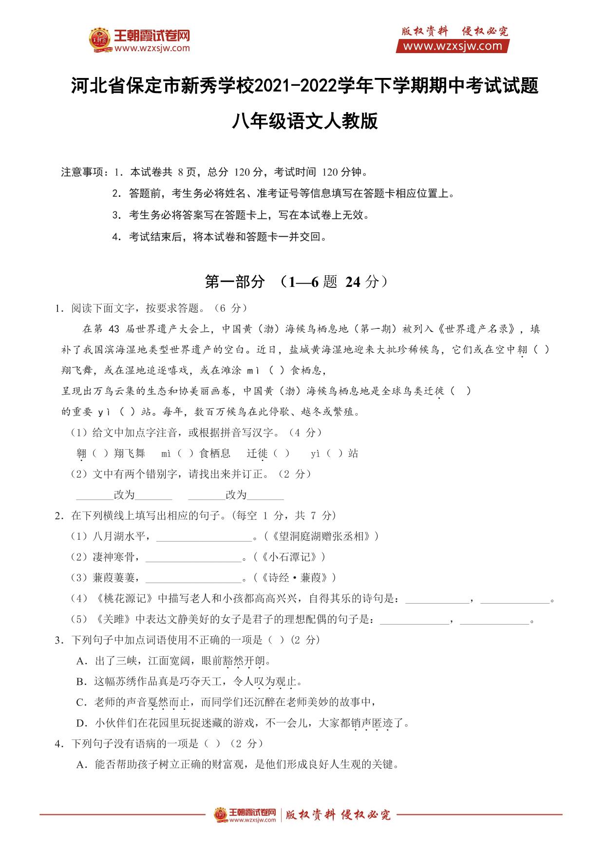 河北省保定市新秀学校2021-2022学年下学期期中考试试题八年级语文(人教版)