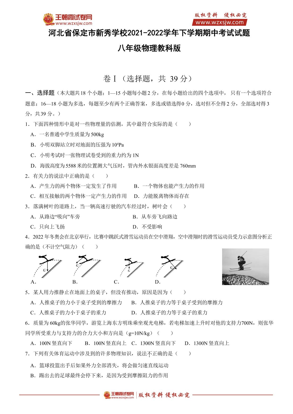 河北省保定市新秀学校2021-2022学年下学期期中考试试题八年级物理(教科版)