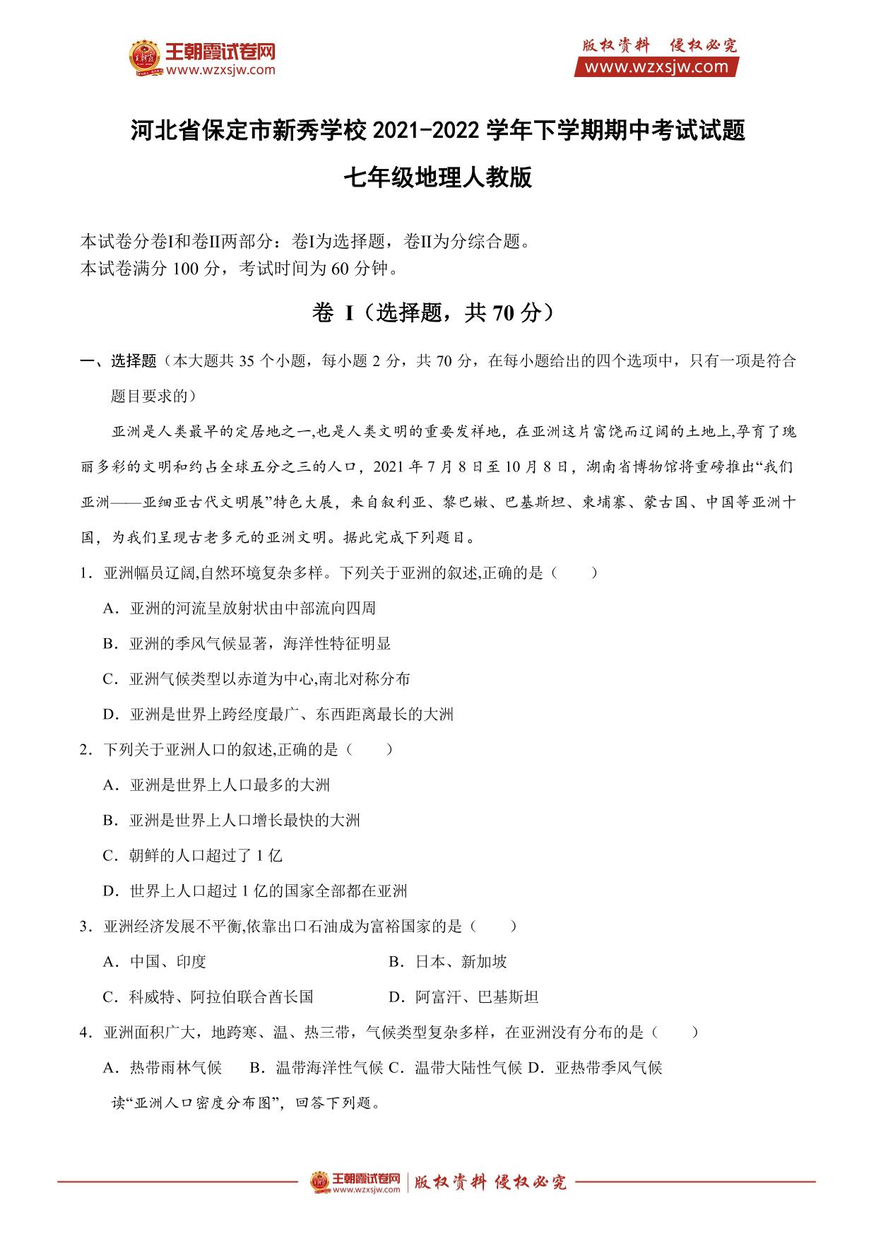 河北省保定市新秀学校2021-2022学年下学期期中考试试题七年级地理(人教版)