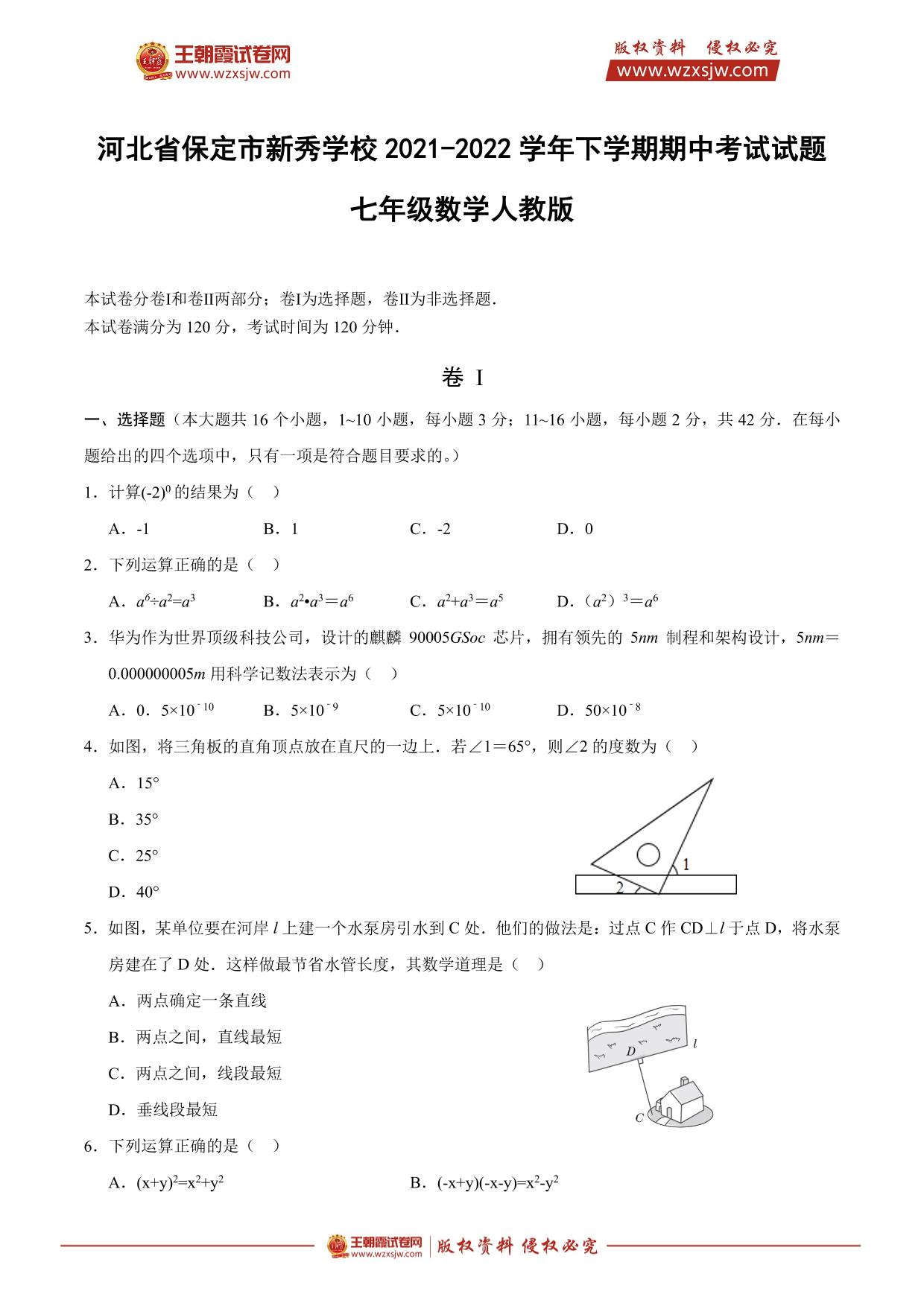 河北省保定市新秀学校2021-2022学年下学期期中考试试题七年级数学(人教版)