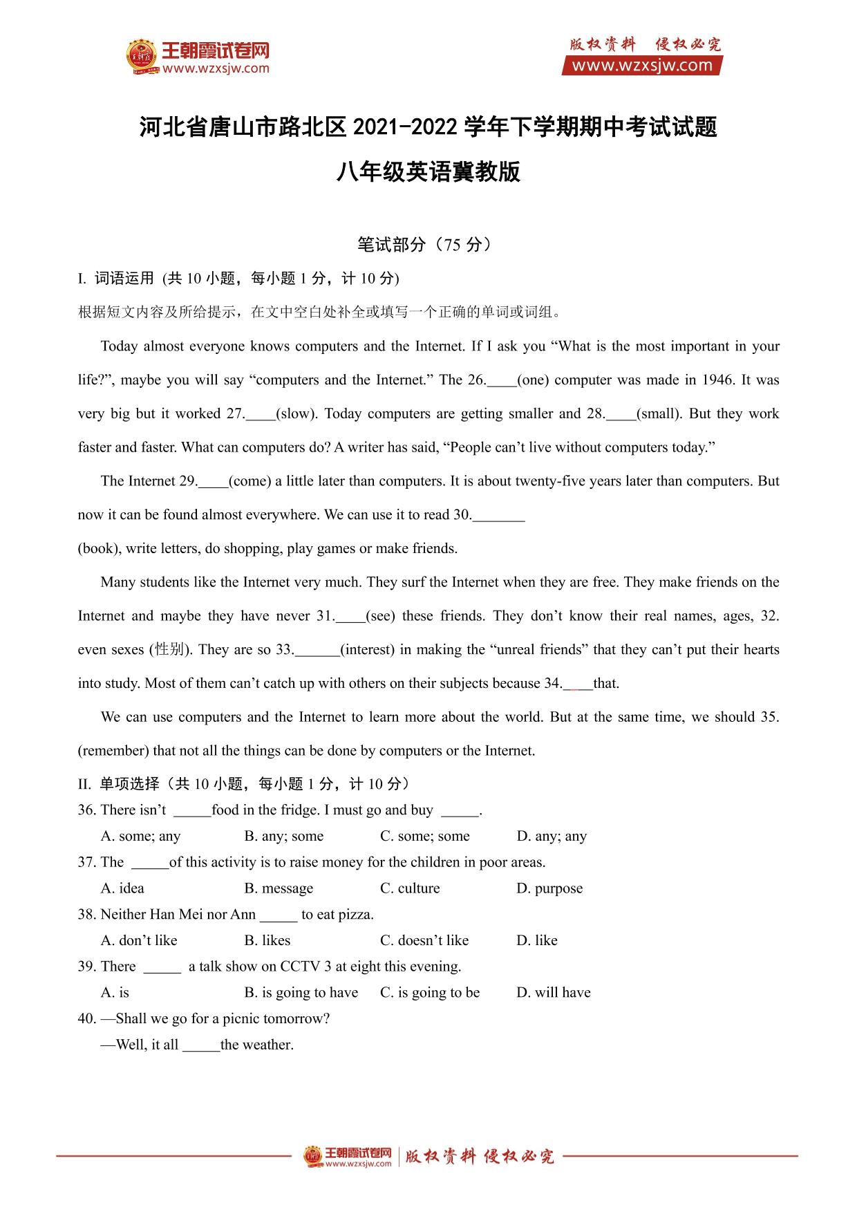 河北省唐山市路北区2021-2022学年下学期期中考试试题八年级英语(冀教版)【无听力音频】