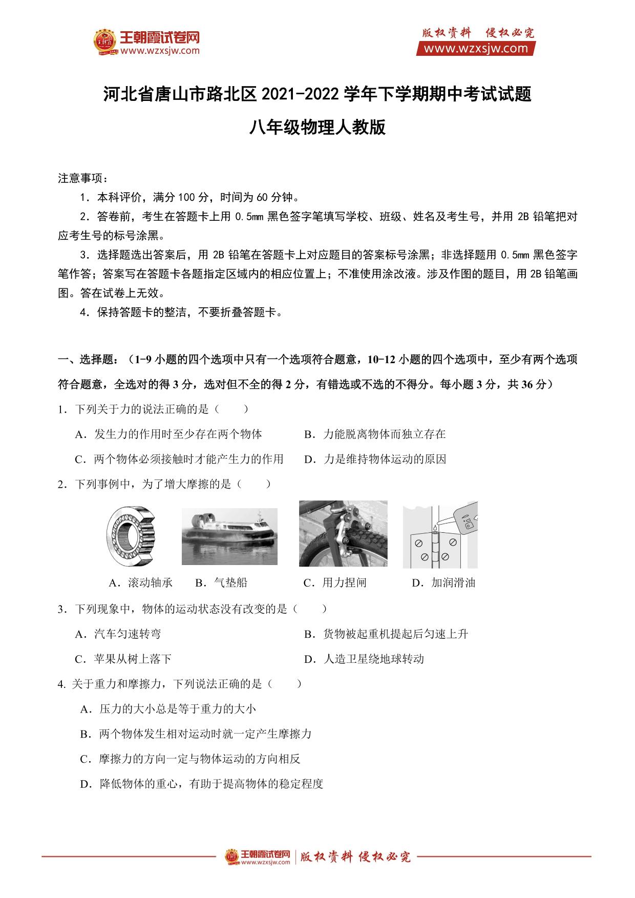 河北省唐山市路北区2021-2022学年下学期期中考试试题八年级物理(人教版)