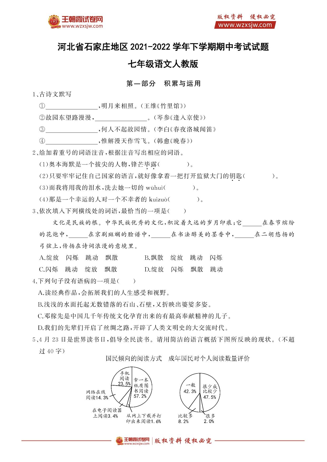 河北省石家庄地区2021-2022学年下学期期中考试试题七年级语文(人教版)