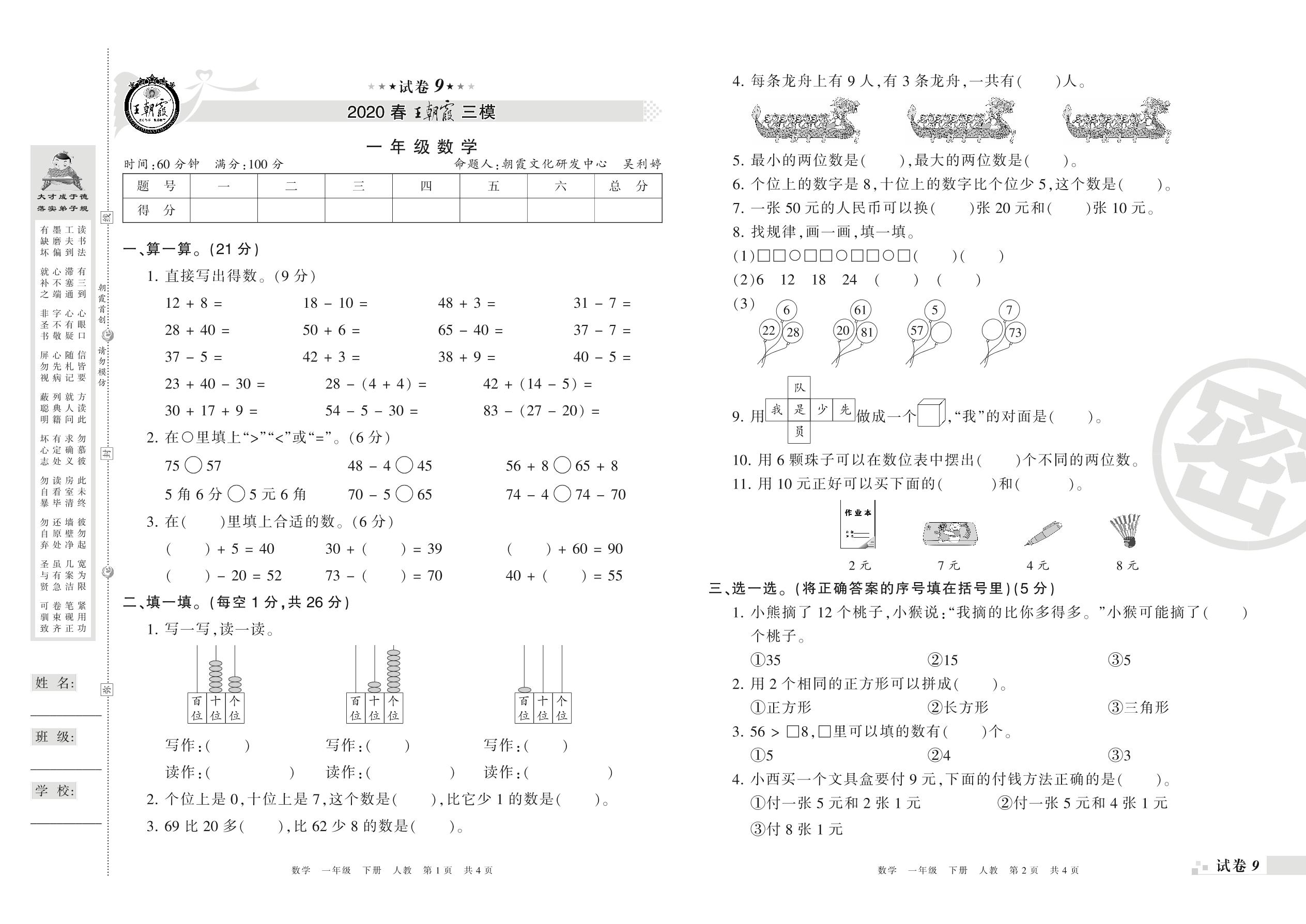 王朝霞期末模拟卷一年级下册数学(人教版)_R210802212937【9】