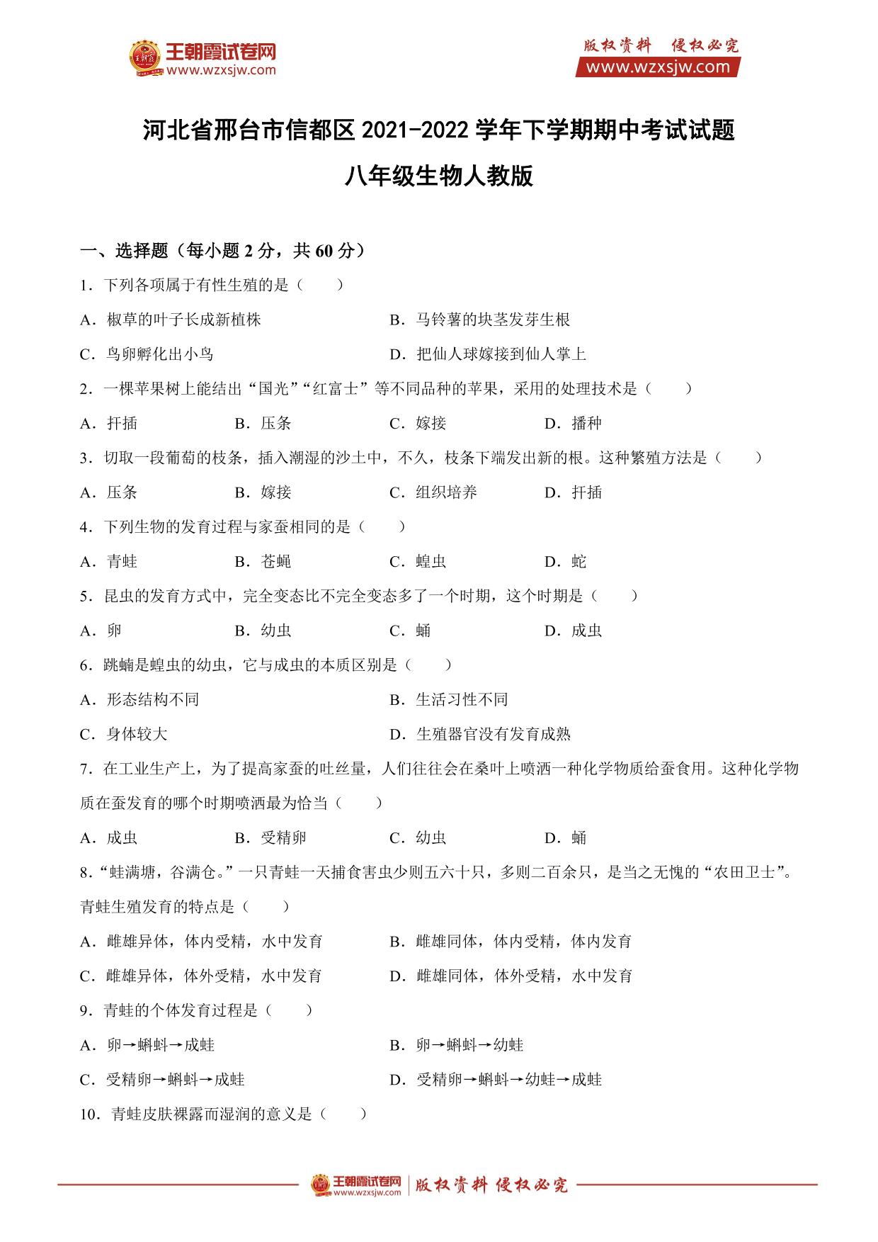 河北省邢台市信都区2021-2022学年下学期期中考试试题八年级生物(人教版)