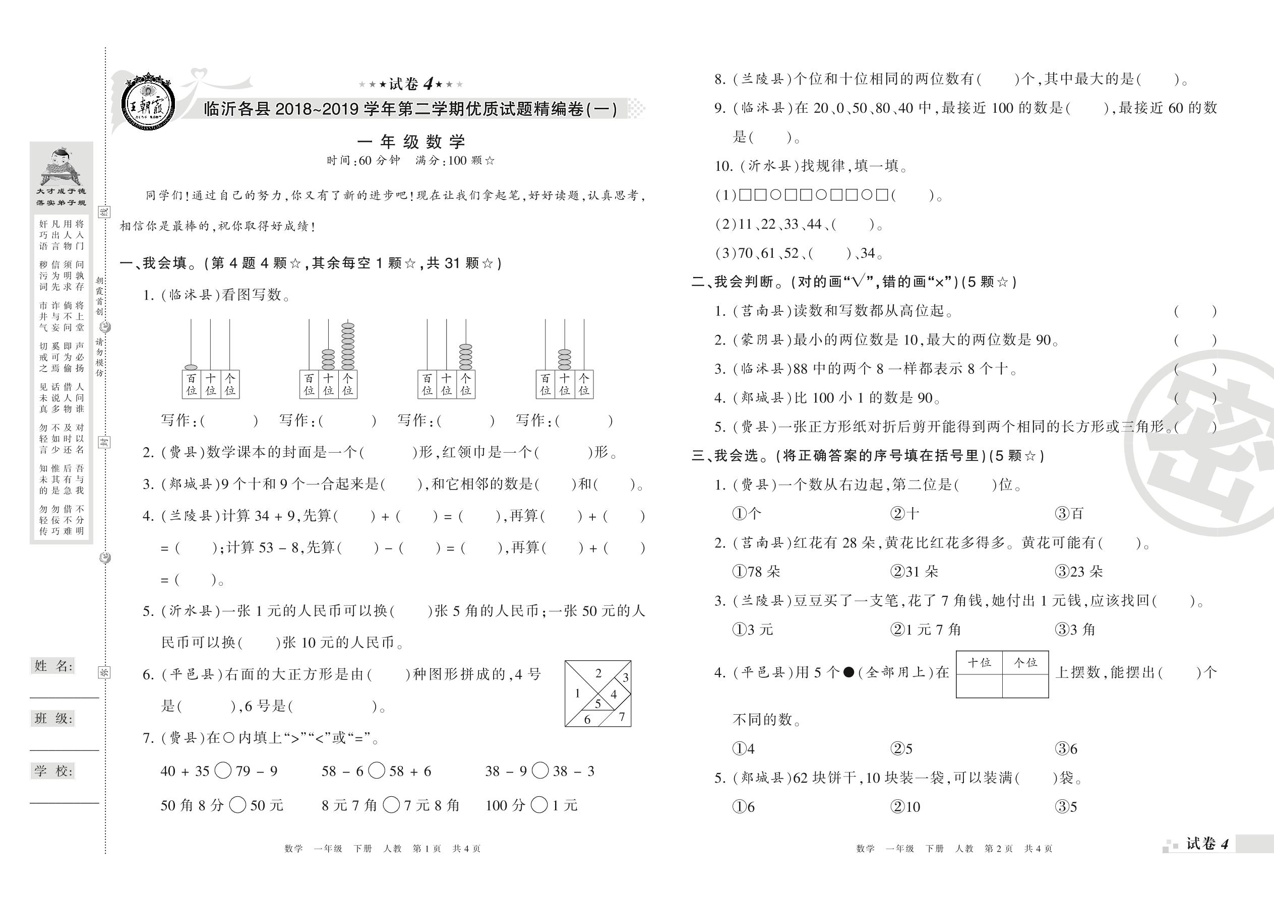 临沂各县优质试题精编卷(一)一年级下册数学(人教版)【4】