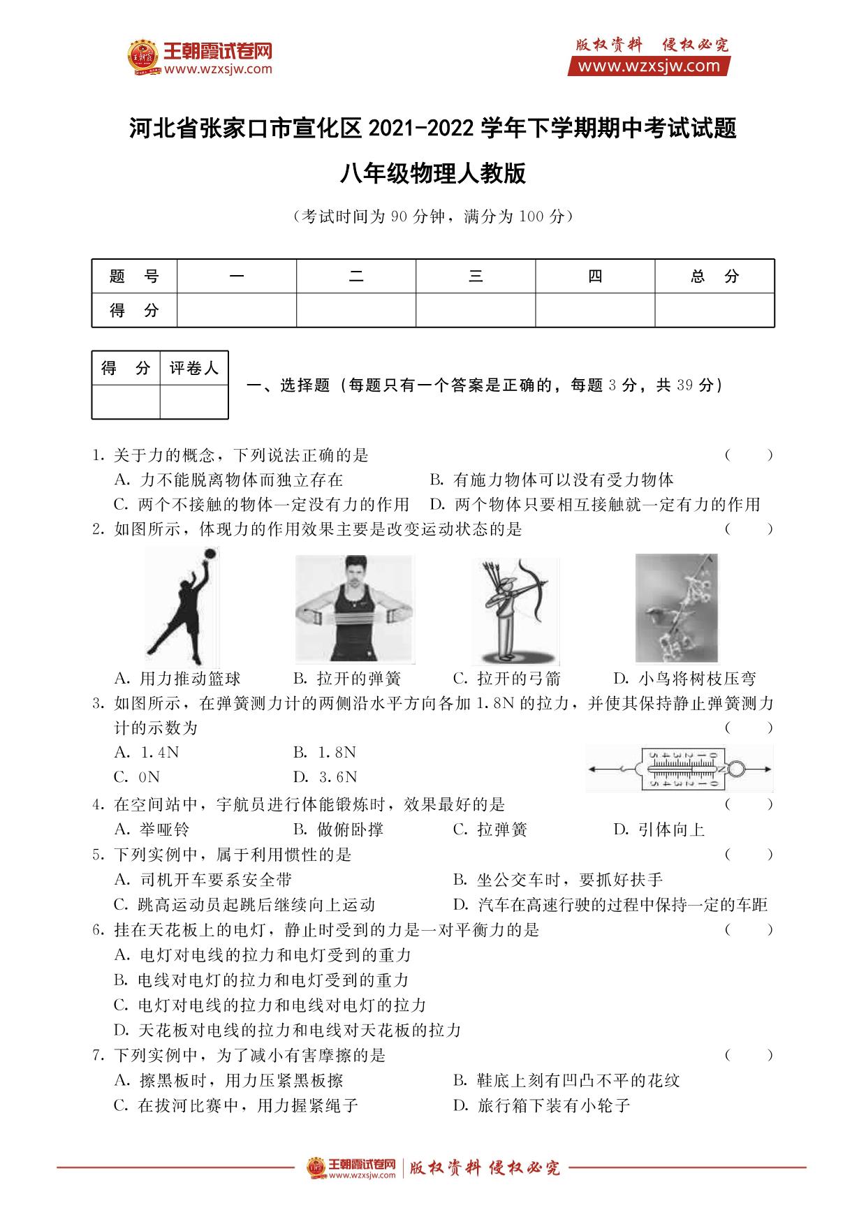 河北省张家口市宣化区 2021-2022学年下学期期中考试试题八年级物理(人教版)