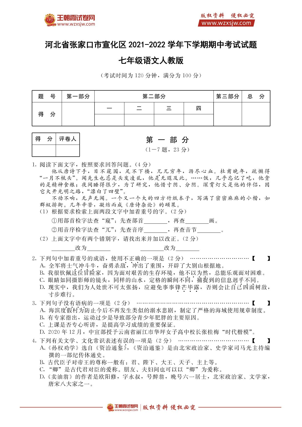 河北省张家口市宣化区 2021-2022学年下学期期中考试试题七年级语文(人教版)