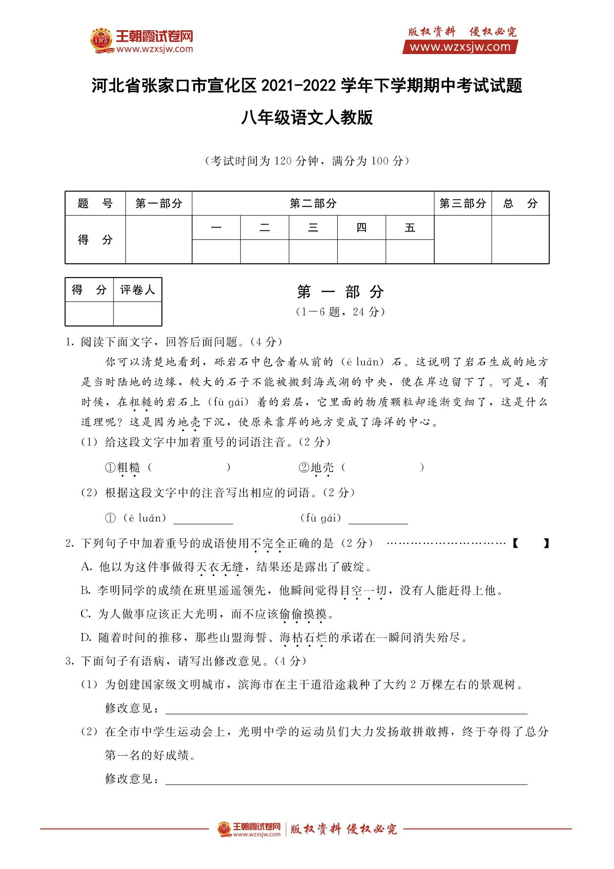 河北省张家口市宣化区 2021-2022学年下学期期中考试试题八年级语文(人教版)