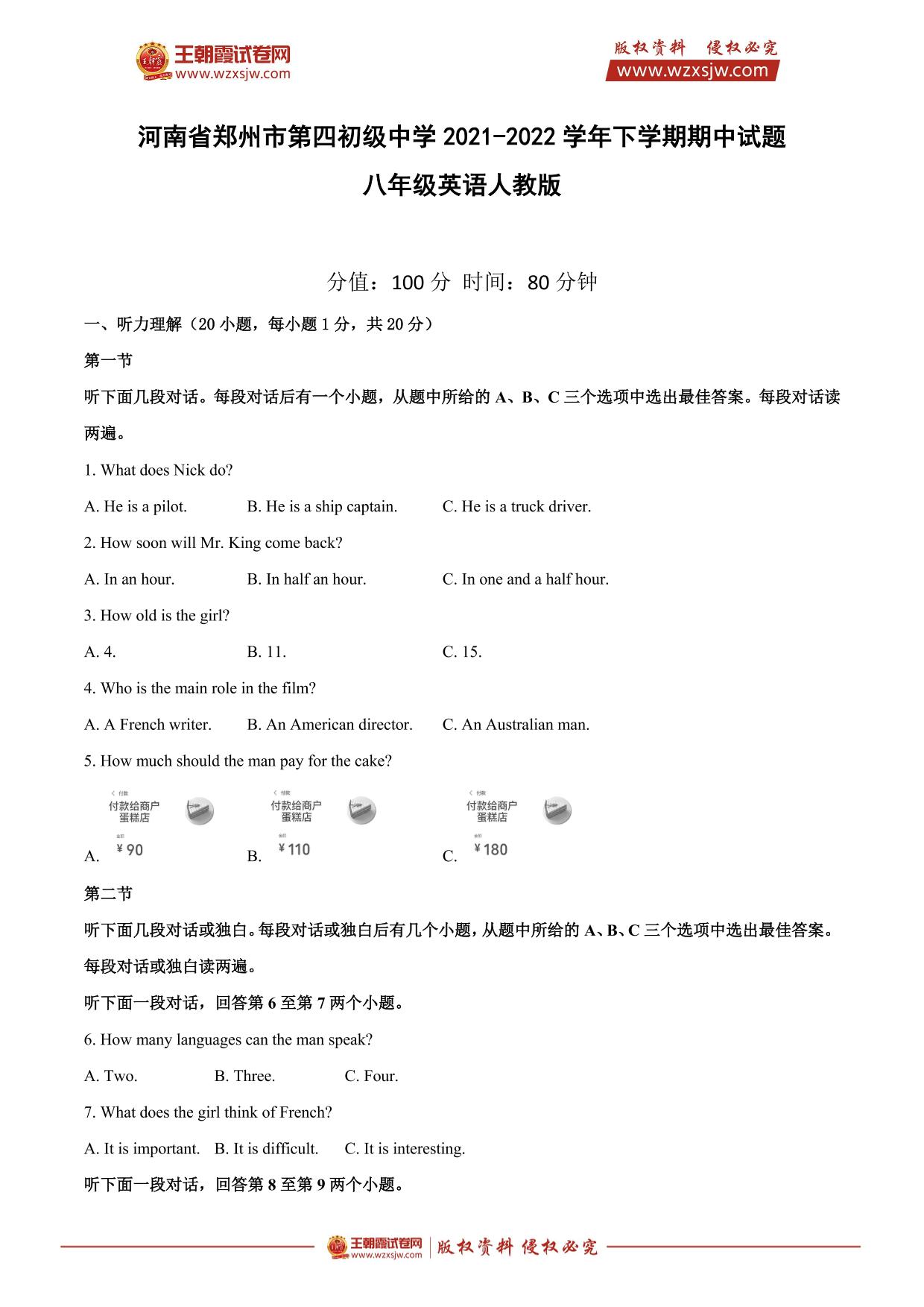 河南省郑州市第四初级中学2021-2022学年下学期期中试题八年级英语(人教版)【无听力音频】