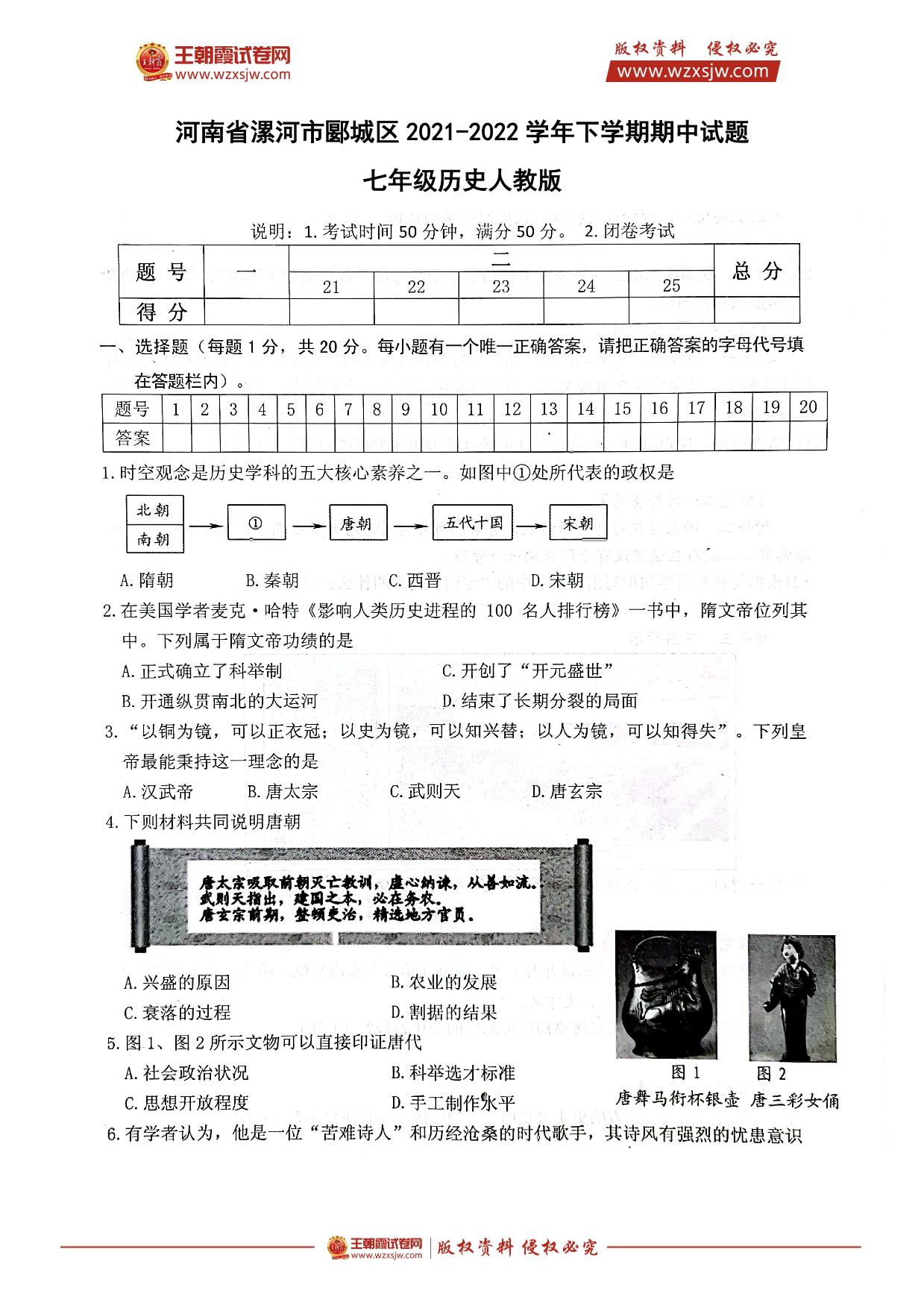 河南省漯河市郾城区2021-2022学年下学期期中试题七年级历史(人教版)