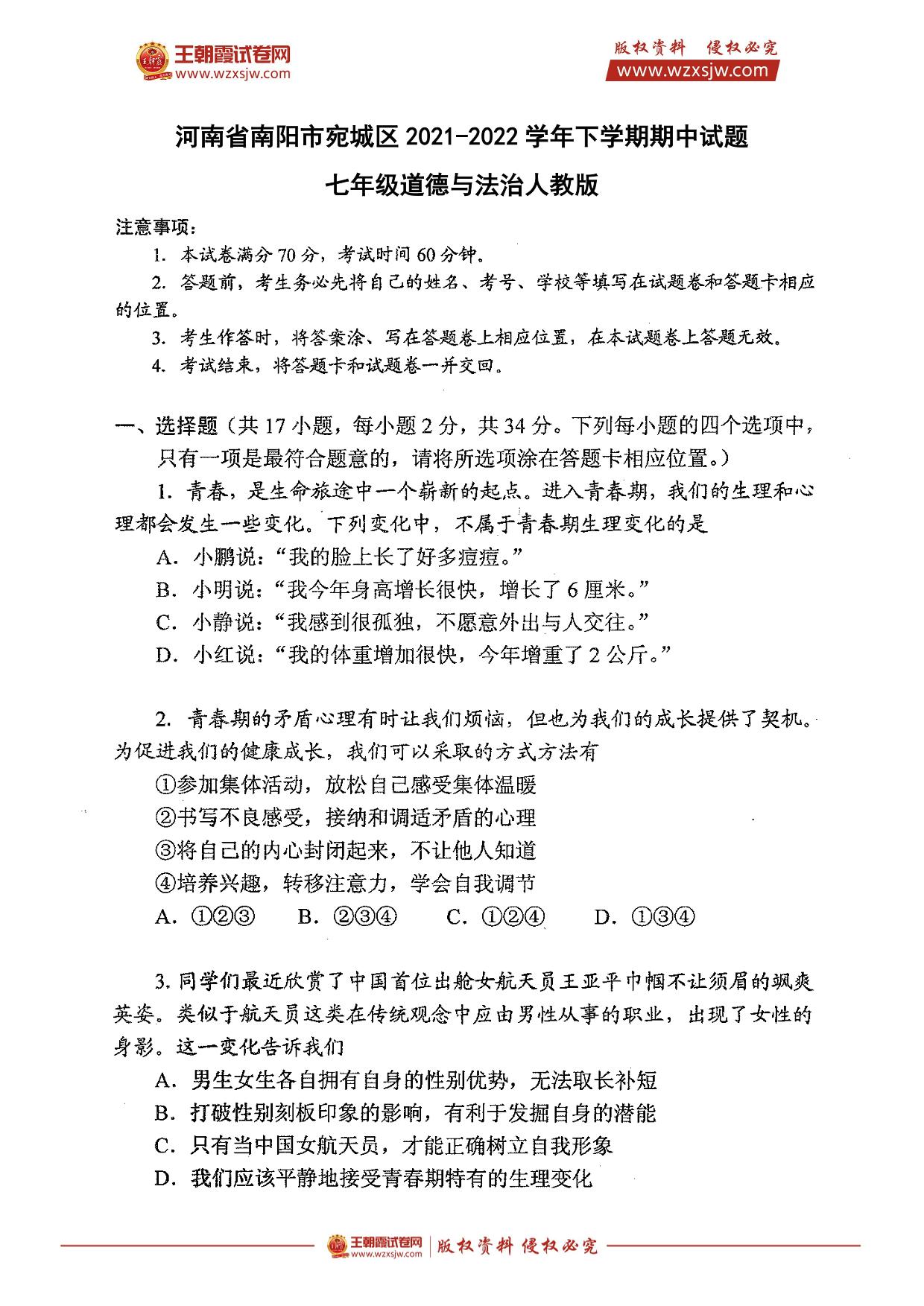 河南省南阳市宛城区2021-2022学年下学期期中试题七年级道德与法治(人教版)