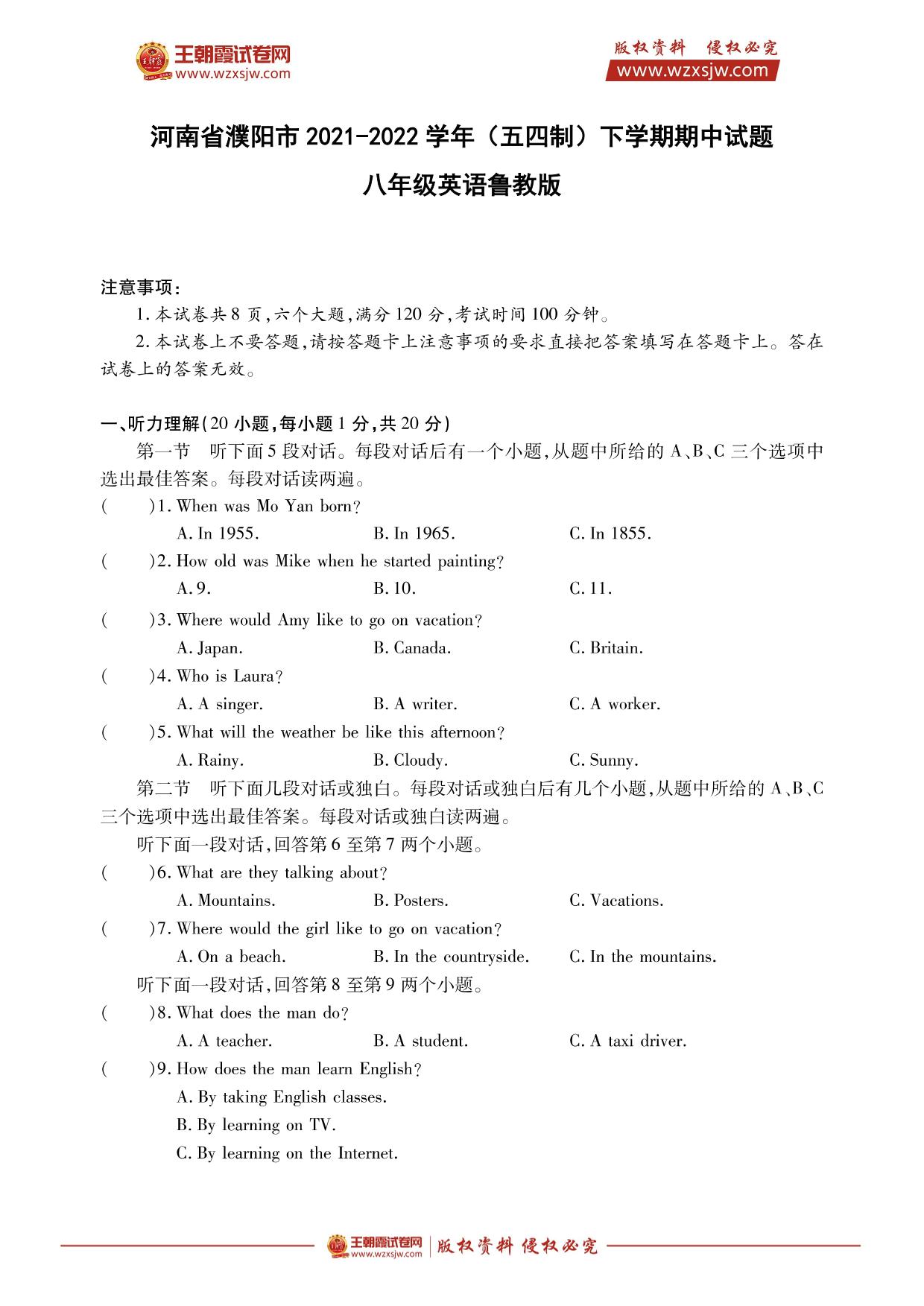 河南省濮阳市2021-2022学年(五四制)下学期期中试题八年级英语(鲁教版)【无听力音频】