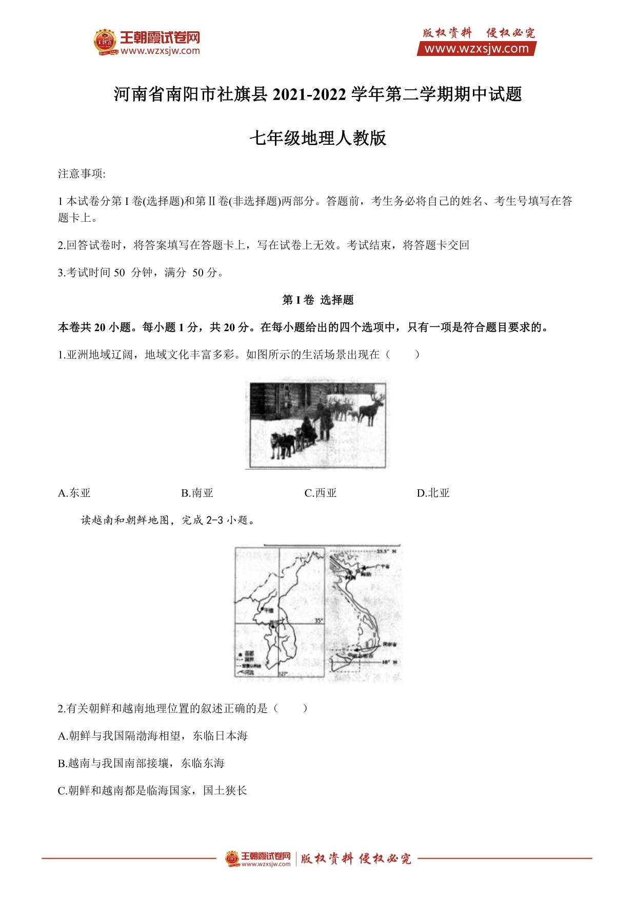 河南省南阳市社旗县2021-2022学年第二学期期中试题七年级地理(人教版)