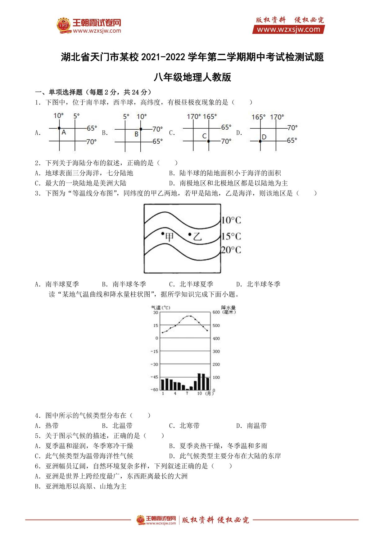 湖北省天门市某校2021-2022学年第二学期期中考试检测试题八年级地理(人教版)