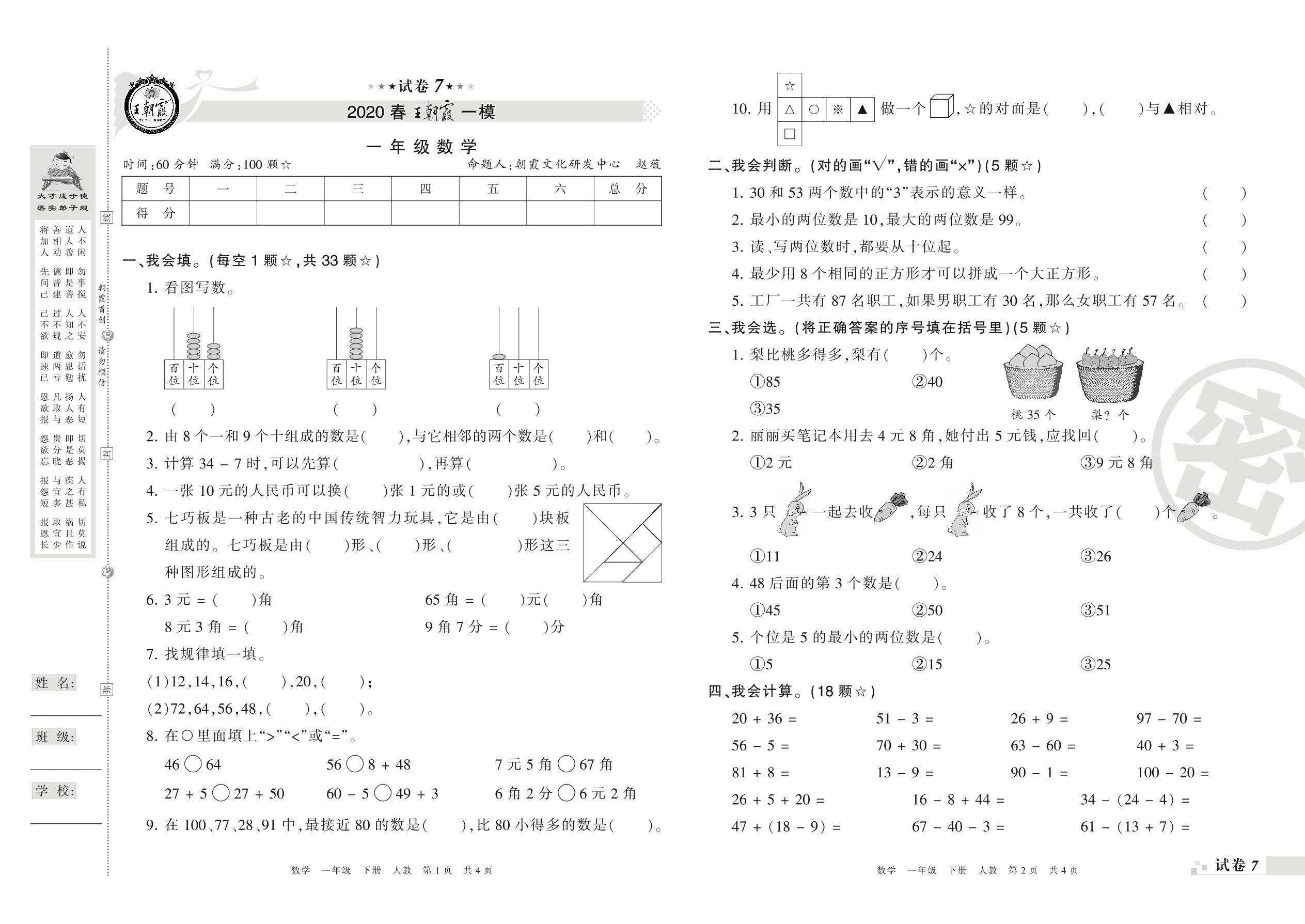 王朝霞期末模拟卷一年级下册数学(人教版)_R210802212951【7】
