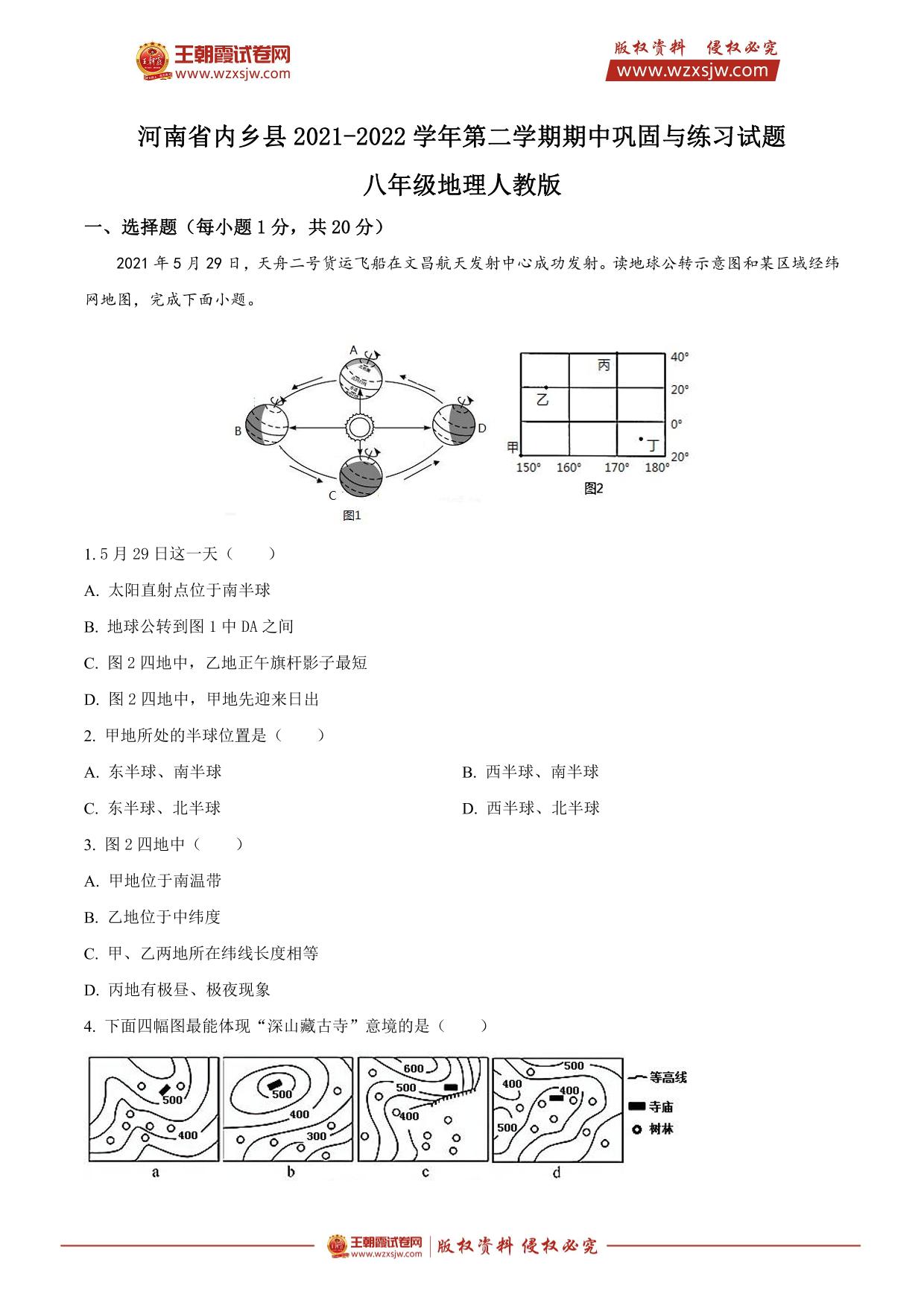 河南省内乡县2021-2022学年第二学期期中巩固与练习试题八年级地理(人教版)