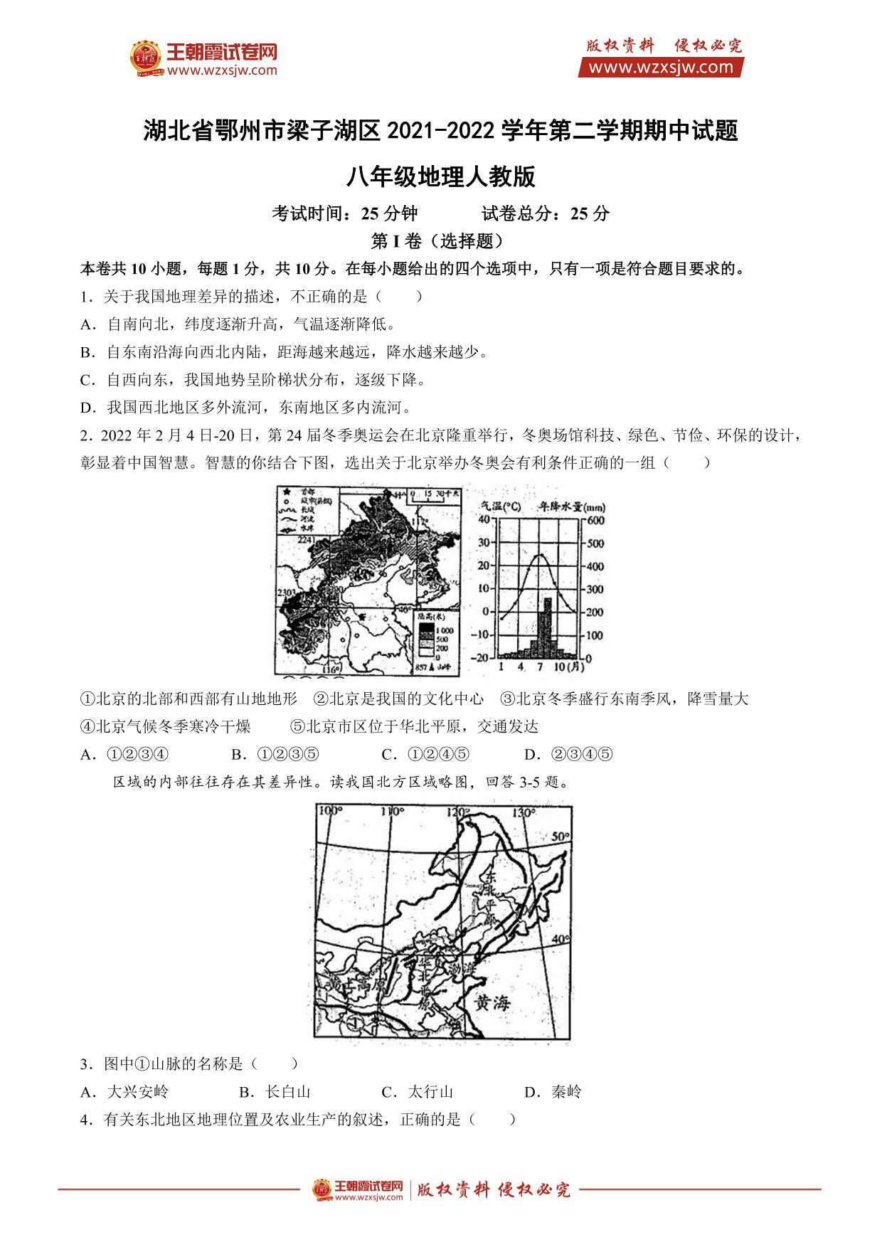 湖北省鄂州市梁子湖区2021-2022学年第二学期期中试题八年级地理(人教版)