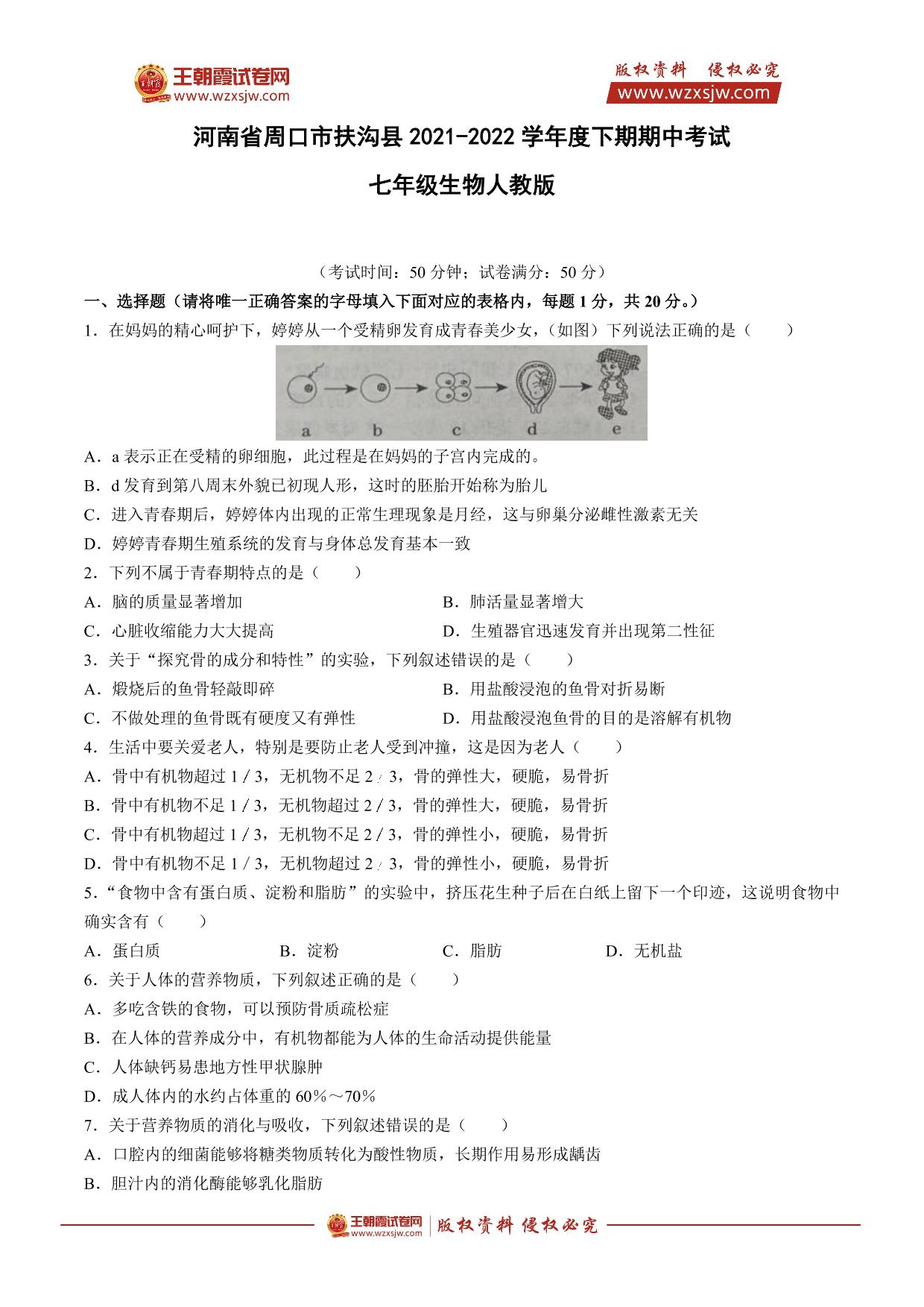 河南省周口市扶沟县2021-2022学年下学期期中考试七年级生物(人教版)