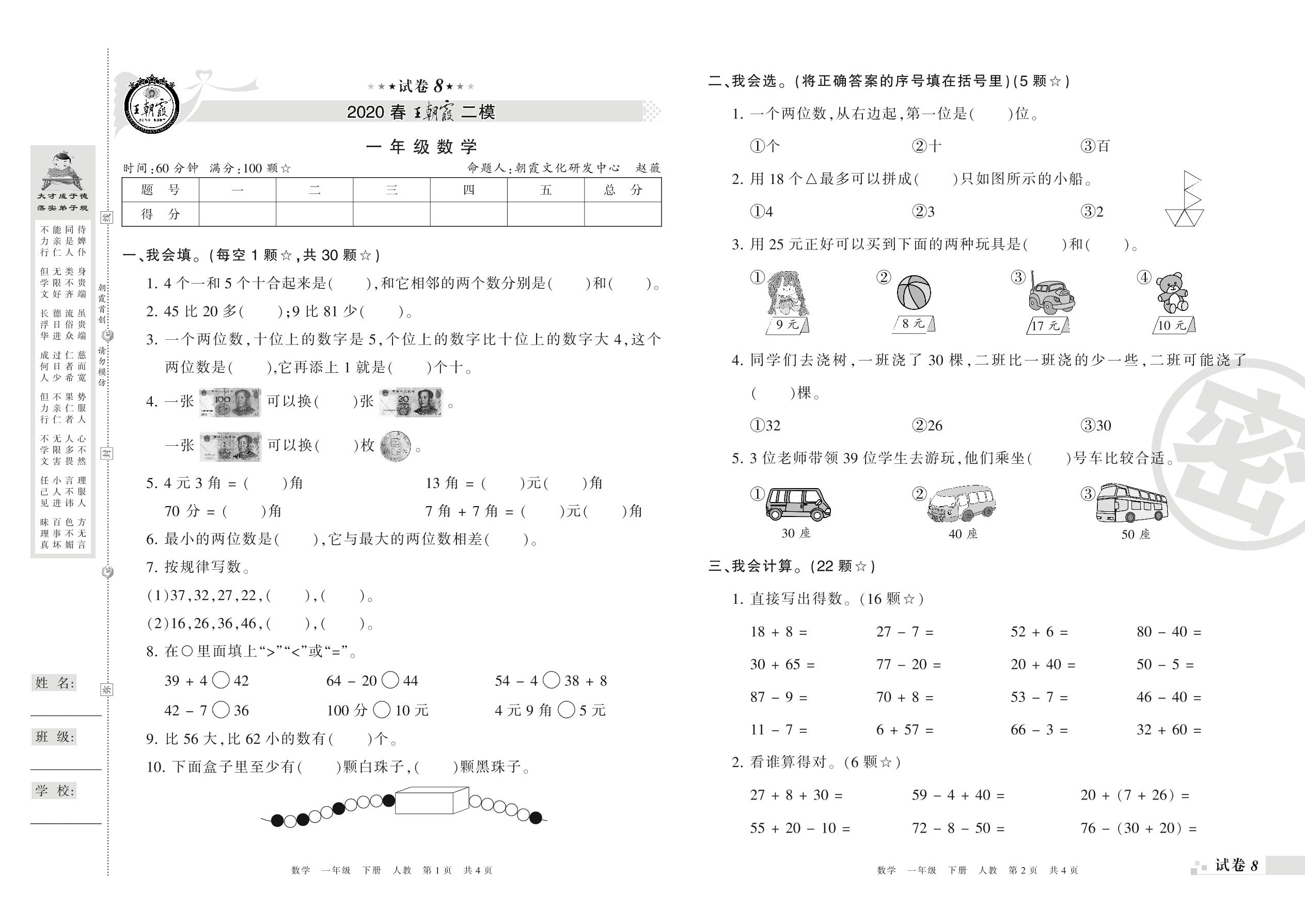 王朝霞期末模拟卷一年级下册数学(人教版)_R210802212955【8】