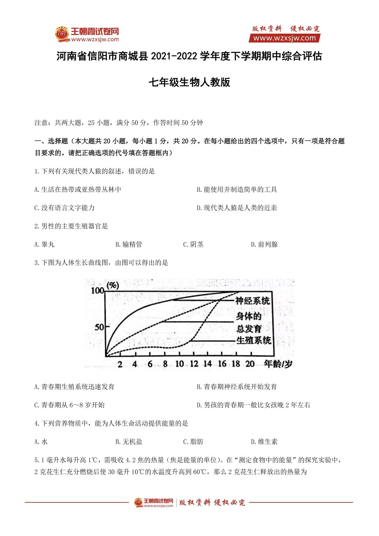 河南省信阳市商城县2021-2022学年度下学期期中综合评估七年级生物(人教版)