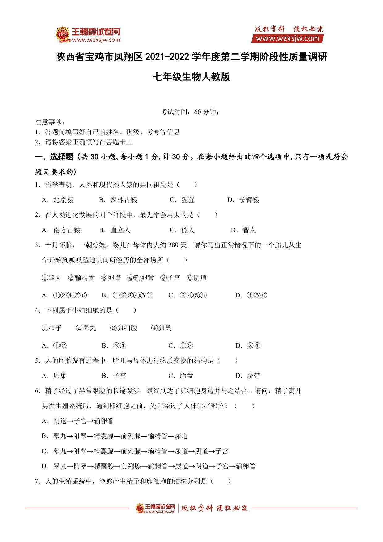 陕西省宝鸡市凤翔区2021-2022学年度第二学期阶段性质量调研七年级生物(人教版)