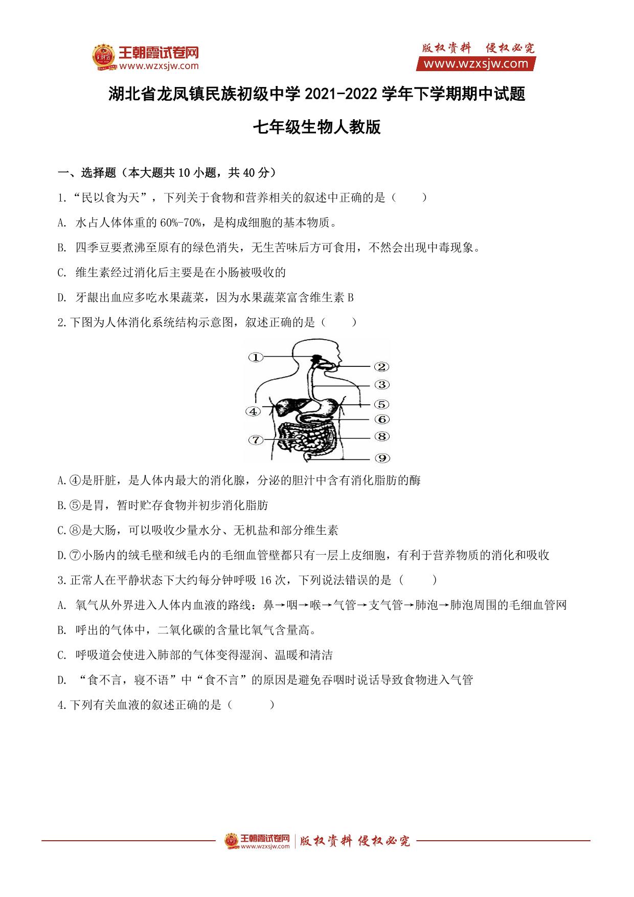 湖北省恩施市龙凤镇民族初级中学2021-2022学年下学期期中试题七年级生物(人教版)