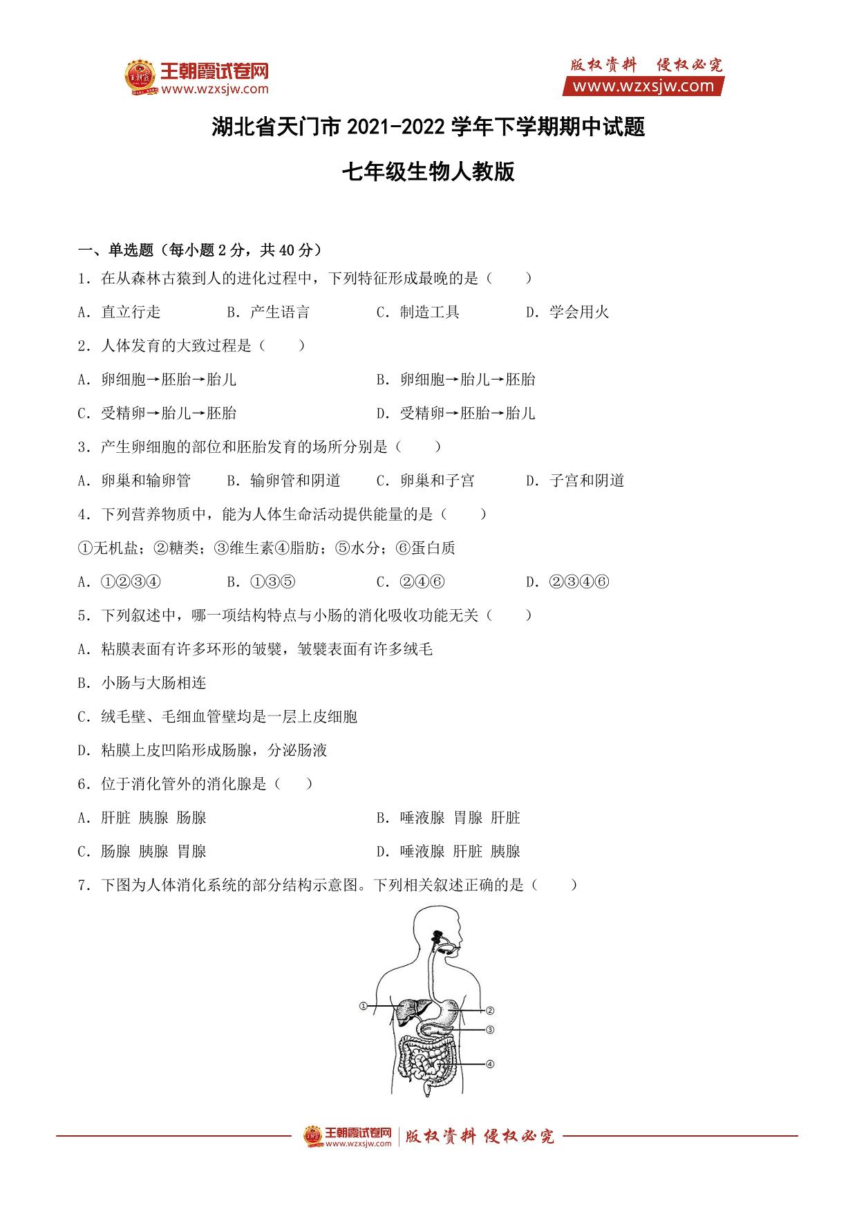 湖北省天门市某校2021-2022学年下学期期中试题七年级生物(人教版)