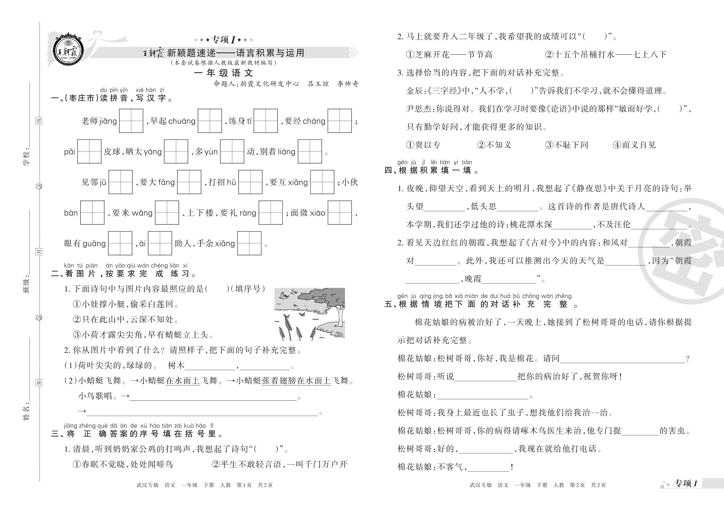 王朝霞期末专项卷——语言积累与运用、句子与口语交际真题归类复习一年级下册语文(人教版)_R210731173453【0】