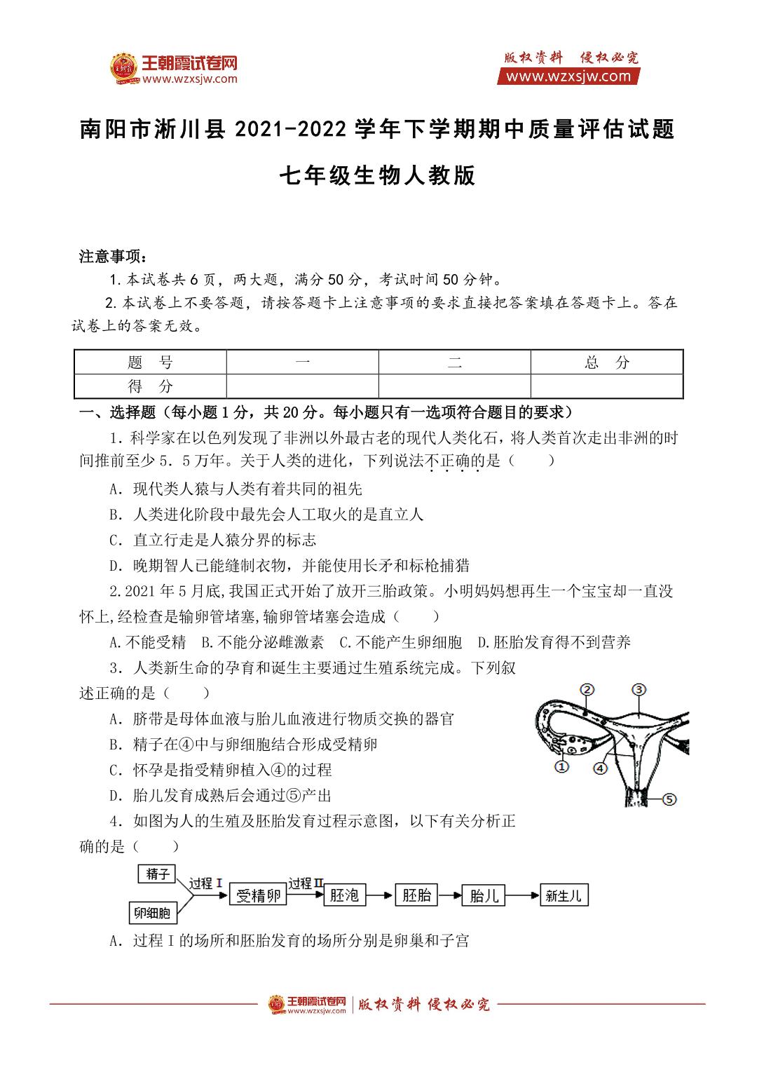 南阳市淅川县2021-2022学年下学期期中质量评估试题七年级生物(人教版)