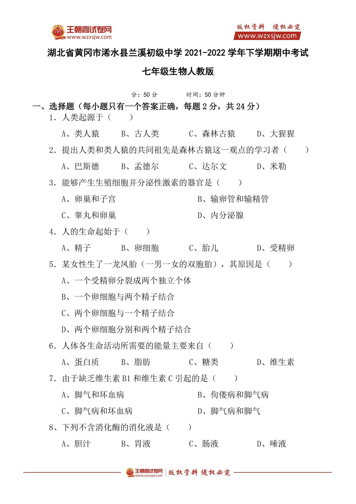 湖北省黄冈市浠水县兰溪初级中学2021--2022学年下学期期中考试七年级生物(人教版)