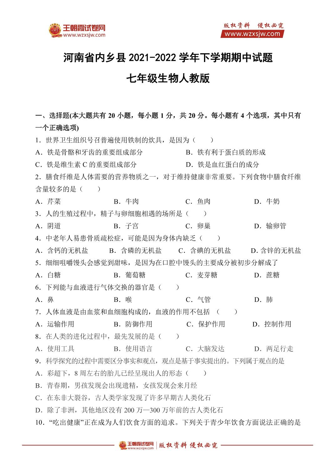 河南省内乡县2021-2022学年下学期期中试题七年级生物(人教版)