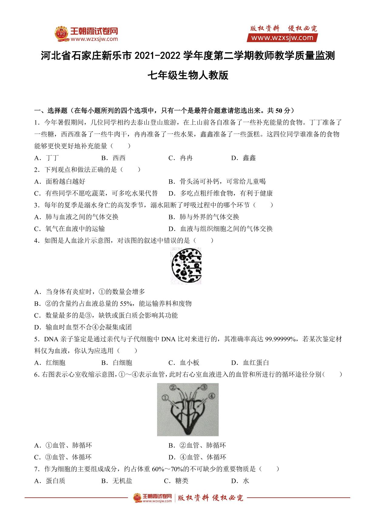 河北省石家庄市新乐市2021-2022学年度第二学期教师教学质量监测七年级生物(人教版)