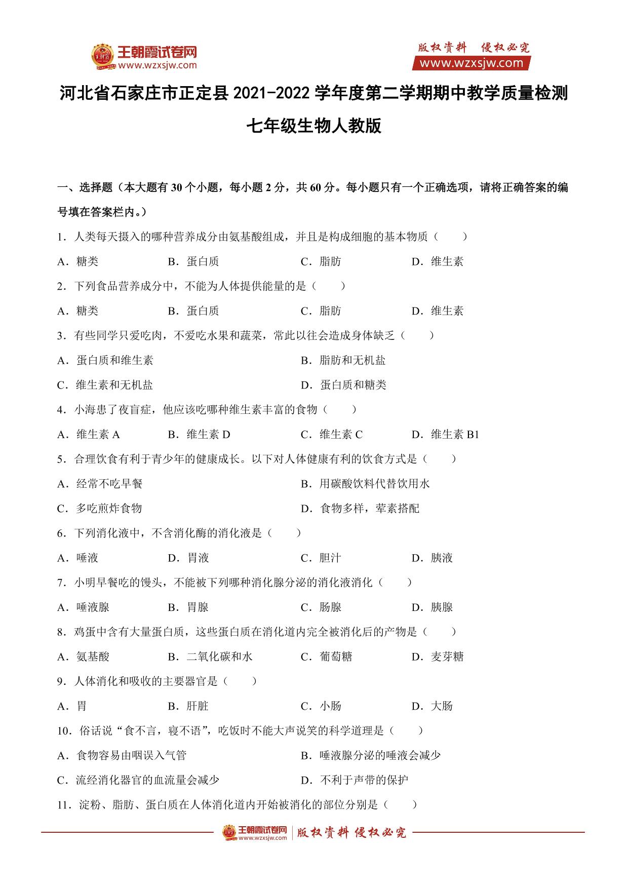 河北省石家庄市正定县2021-2022学年度第二学期期中教学质量检测七年级生物(人教版)
