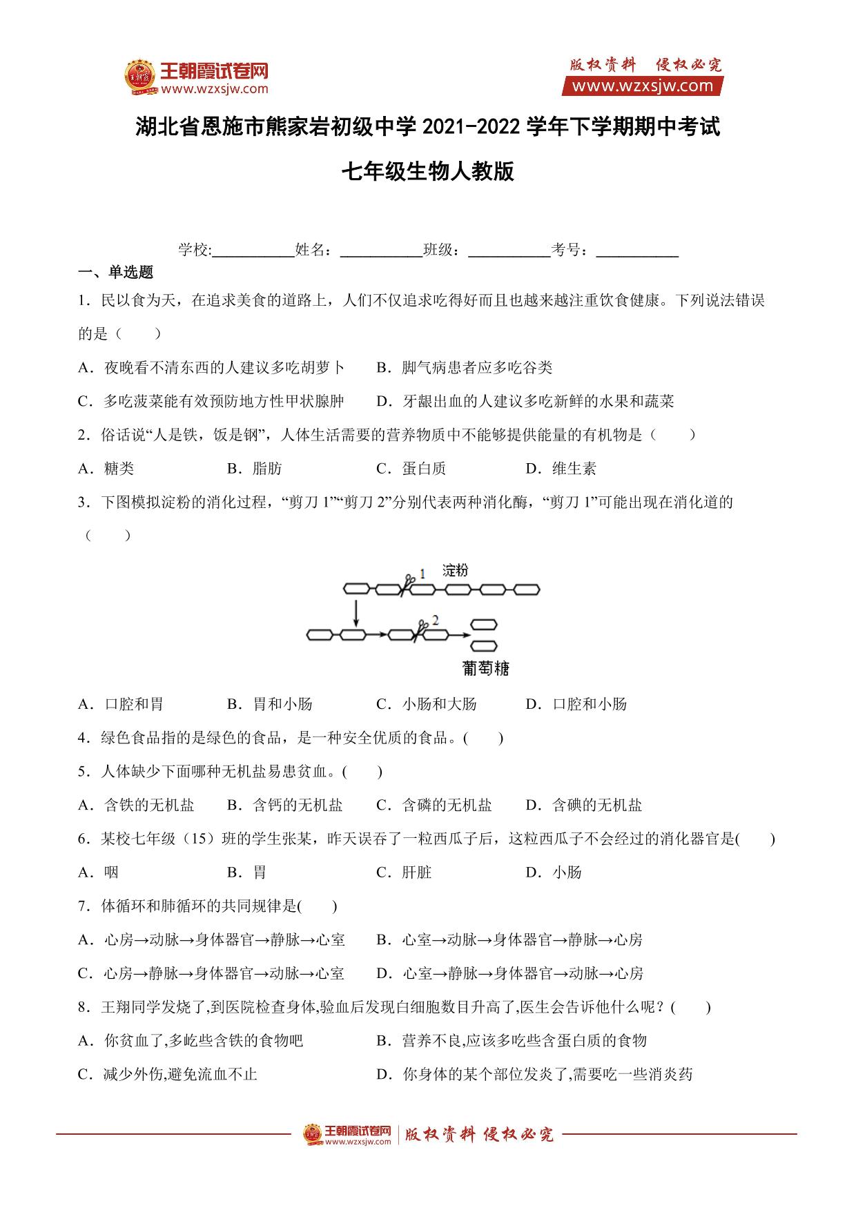 湖北省恩施市熊家岩初级中学2021-2022学年下学期期中考试七年级生物(人教版)