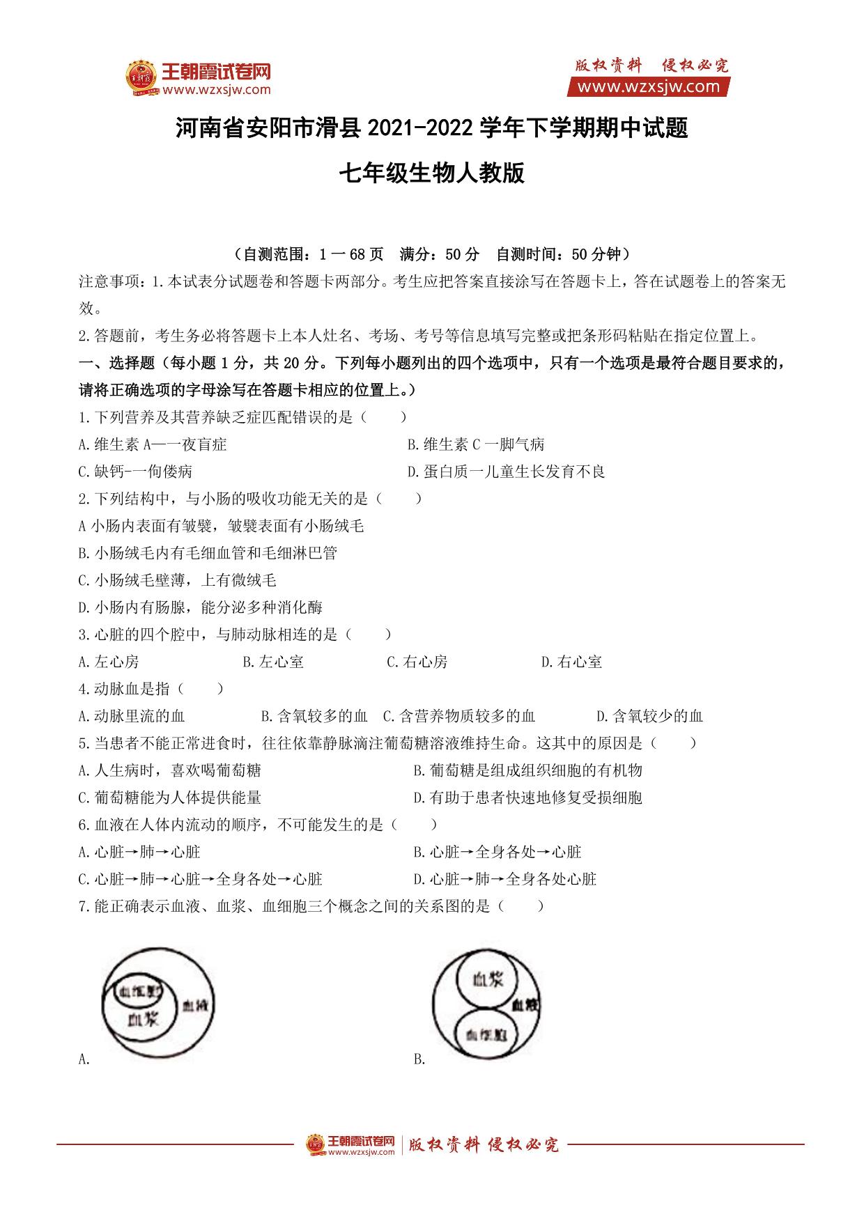 河南省安阳市滑县2021-2022学年下学期期中试题七年级生物(人教版)