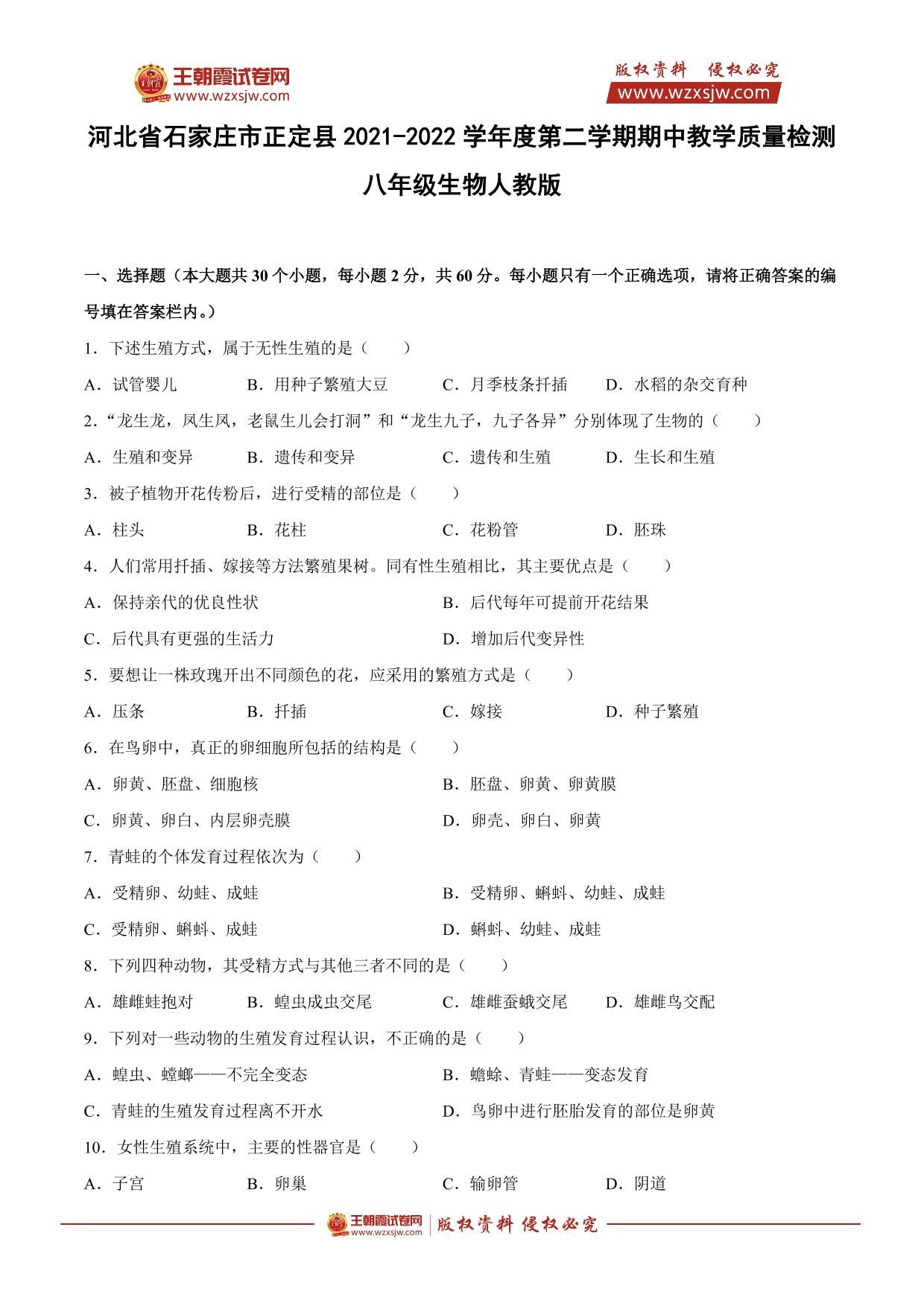 河北省石家庄市正定县2021-2022学年度第二学期期中教学质量检测八年级生物(人教版)