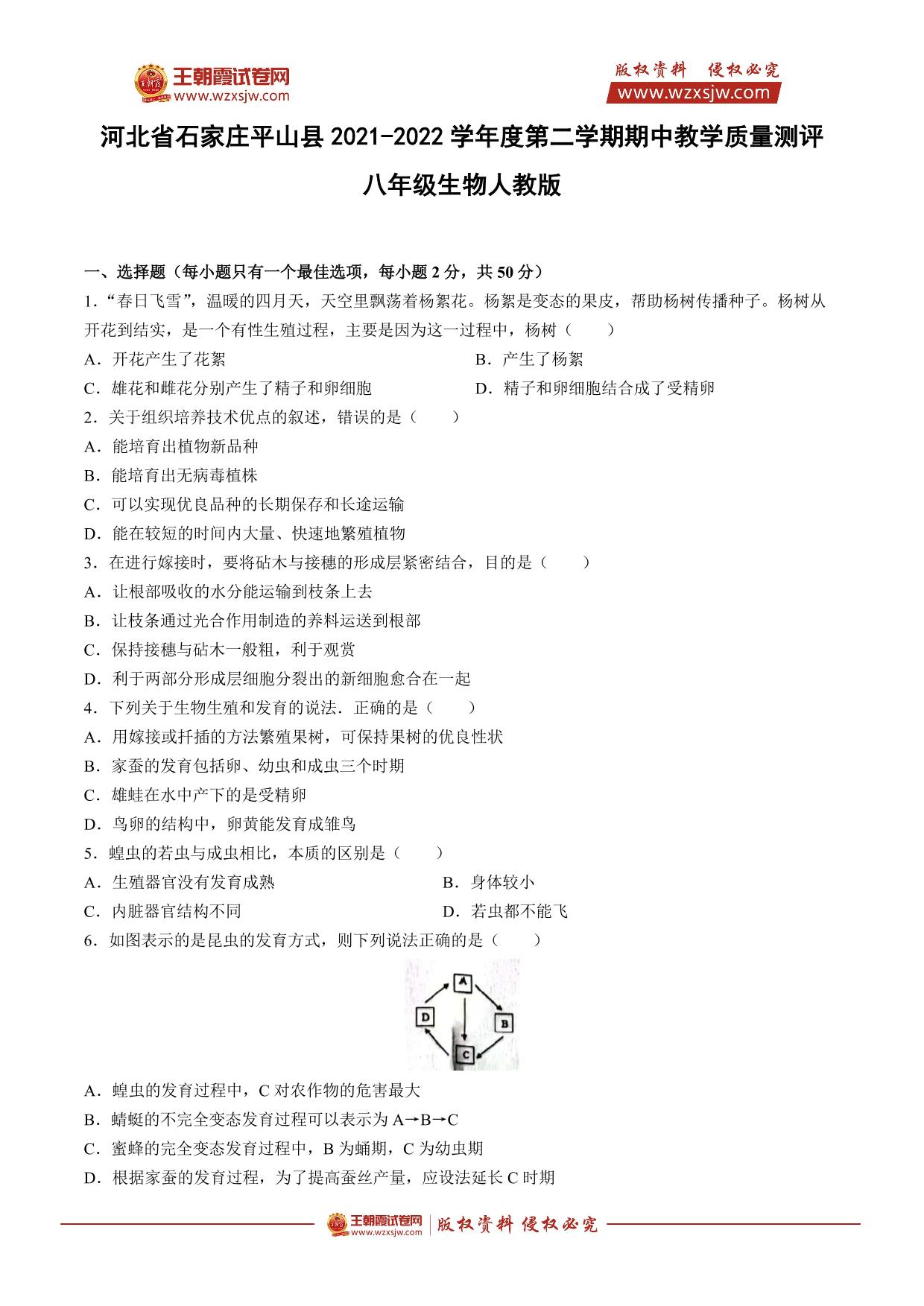 河北省石家庄市平山县2021-2022学年度第二学期期中教学质量测评八年级生物(人教版)