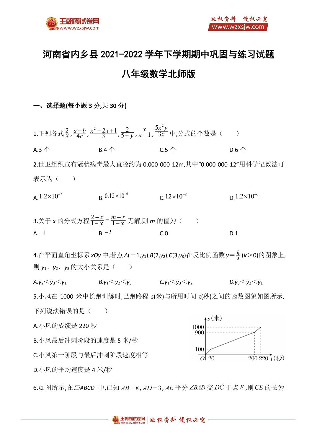 河南省内乡县2021-2022学年下学期期中巩固与练习试题八年级数学(北师版)